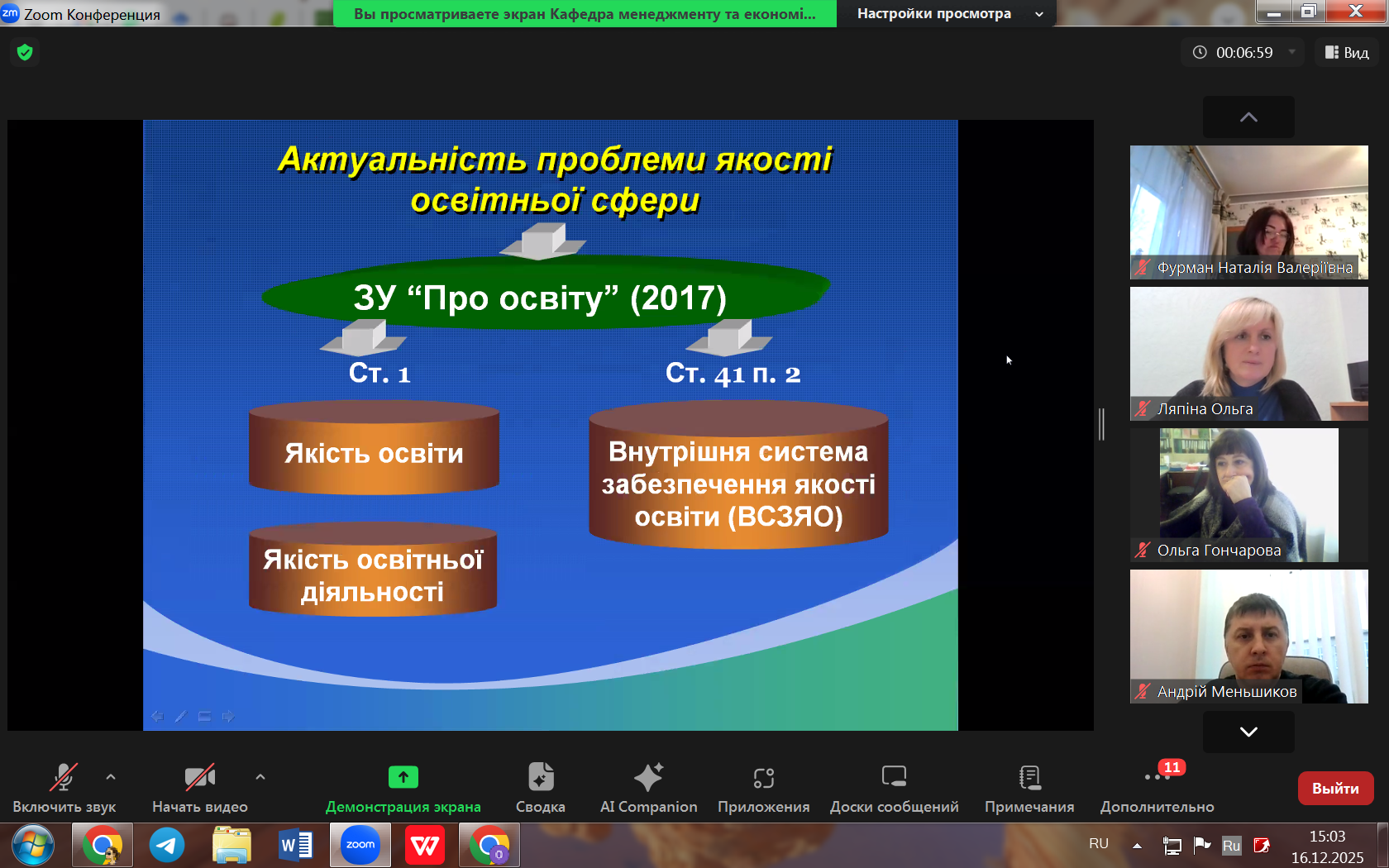 28 жовтня на засіданні кафедри науково-педагогічні працівники обговорили результати наукової діяльності кафедри за 2025 рік і визначили завдання на наступний рік. Одноголосно було затверджено звіт про наукову діяльність кафедри. Так, упродовж року відбулися спільні заходи з НАН України (науково-дослідна практика майбутніх магістрів економіки), НАПН України (науково-практичні конференції, гостьові лекції з Навчально-науковим інститутом менеджменту і психології ДВНЗ «УМО» НАПН України). Співробітники кафедри взяли участь у науково-методичних заходах місцевих громад, стали організаторами та співорганізаторами міжнародних і всеукраїнських науково-практичних конференцій, виявили достатній рівень публікаційної активності. Упродовж року здобувачі освіти зі спеціальностей 051 Економіка, 073 Менеджмент брали активну участь у наукових подіях, виборюючи зокрема призові місця. Докладно результати наукової роботи висвітлено в презентації.