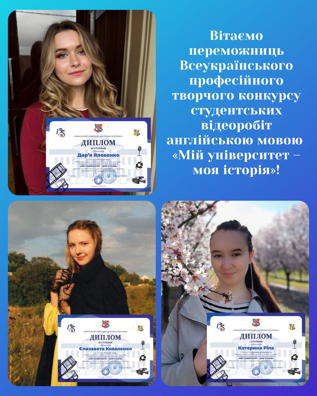 Вітаємо лауреатів Всеукраїнського професійного творчого конкурсу студентських відеоробіт “My University, My Story”!