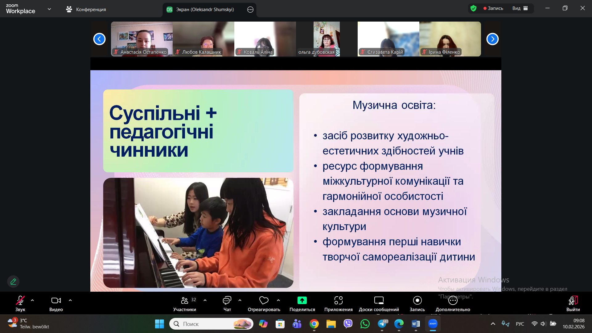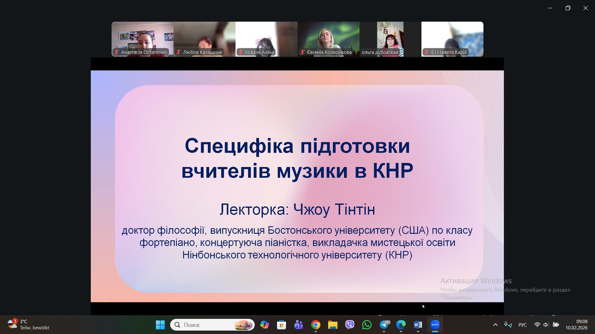 10.02.2026 відбулася гостьова лекція доктора філософії у галузі педагогіки Чжоу Тінтін на тему «Специфіка підготовки вчителів музики в КНР». Доктор Чжоу Тінтін захищала свою наукову роботу в ХНПУ імені Г.С. Сковороди, сьогодні вона є відомою в КНР концертуючою піаністкою, а також викладачем університету м. Нінбо. На зустрічі були присутні викладачі та здобувачі освіти кафедри східних мов, кафедри початкової і професійної освіти ХНПУ імені Г.С. Сковороди та Харківської Гуманітарно-педагогічної академії.
