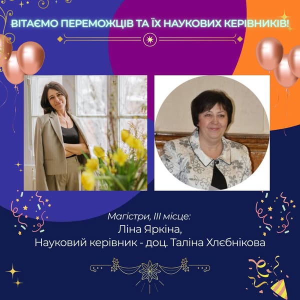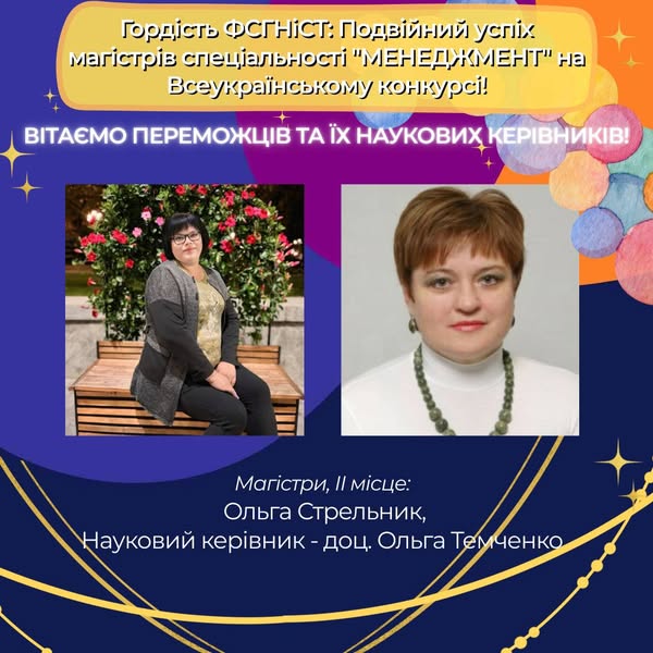 25-26 вересня 2025 року в місті Одеса на базі Державного університету інтелектуальних технологій і зв’язку відбувся 2-й етап Всеукраїнського конкурсу кваліфікаційних робіт зі спеціальності 073 Менеджмент. Випускники нашого університету під керівництвом доцентів кафедри менеджменту та економіки взяли участь у цій освітній події. Цього року маємо прекрасні результати: кваліфікаційна робота Ліни Яркіної «Управління процесом створення інноваційного продукту на прикладі приватної школи» посіла 3 місце (науковий керівник – к.пед.н., доц. Таліна Хлєбнікова); кваліфікаційна робота Ольги Стрельник «Розвиток інклюзивного середовища закладу освіти як управлінська проблема» (науковий керівник – к.пед.н., доц. Ольга Темченко) виборола 2 місце! Пишаємося досягненнями наших здобувачок ОП «Управління закладом освіти»! Щиро вітаємо випускниць та їхніх наукових керівників із перемогою! Бажаємо нових звершень у професійній і науковій діяльності!