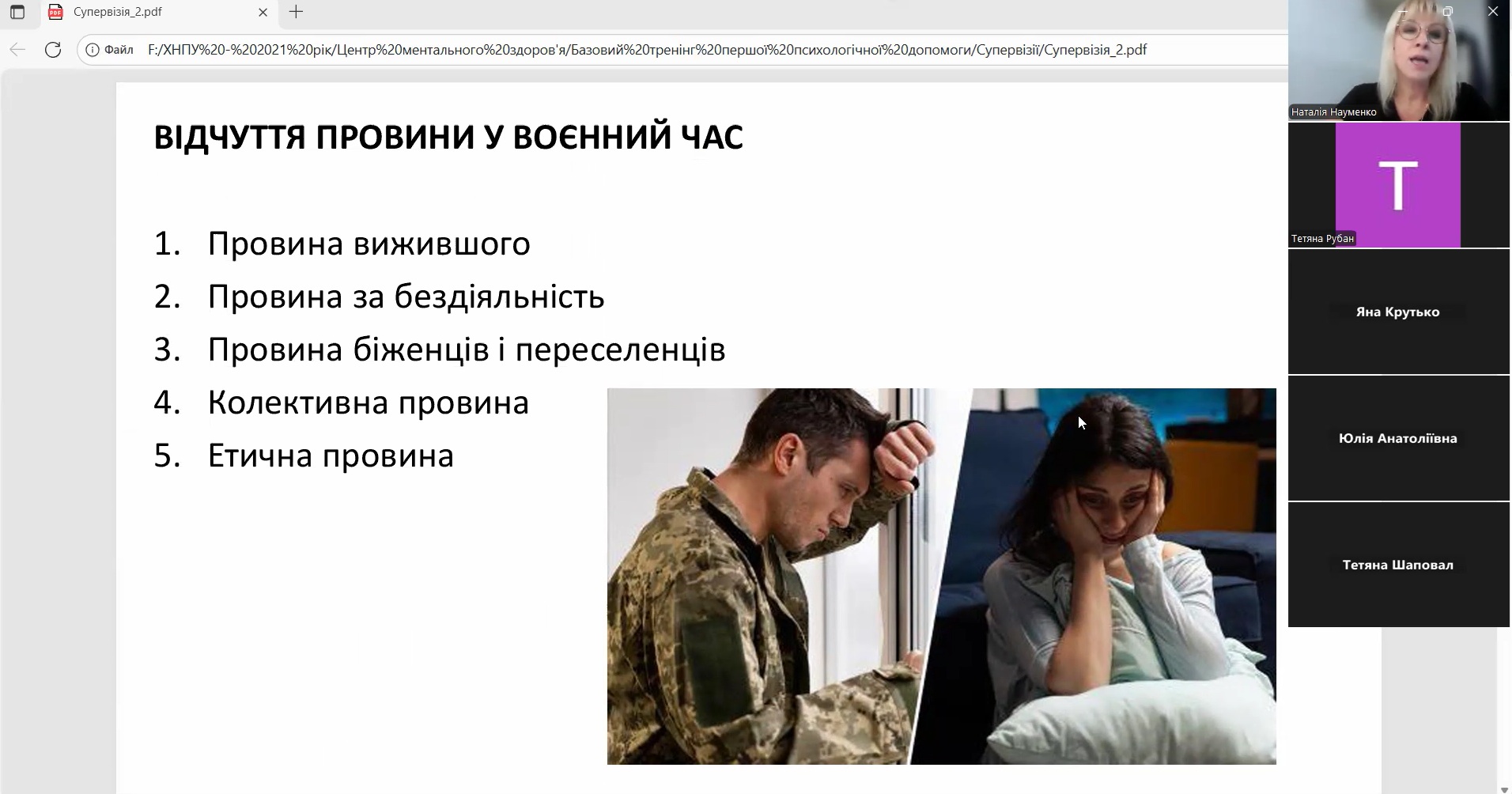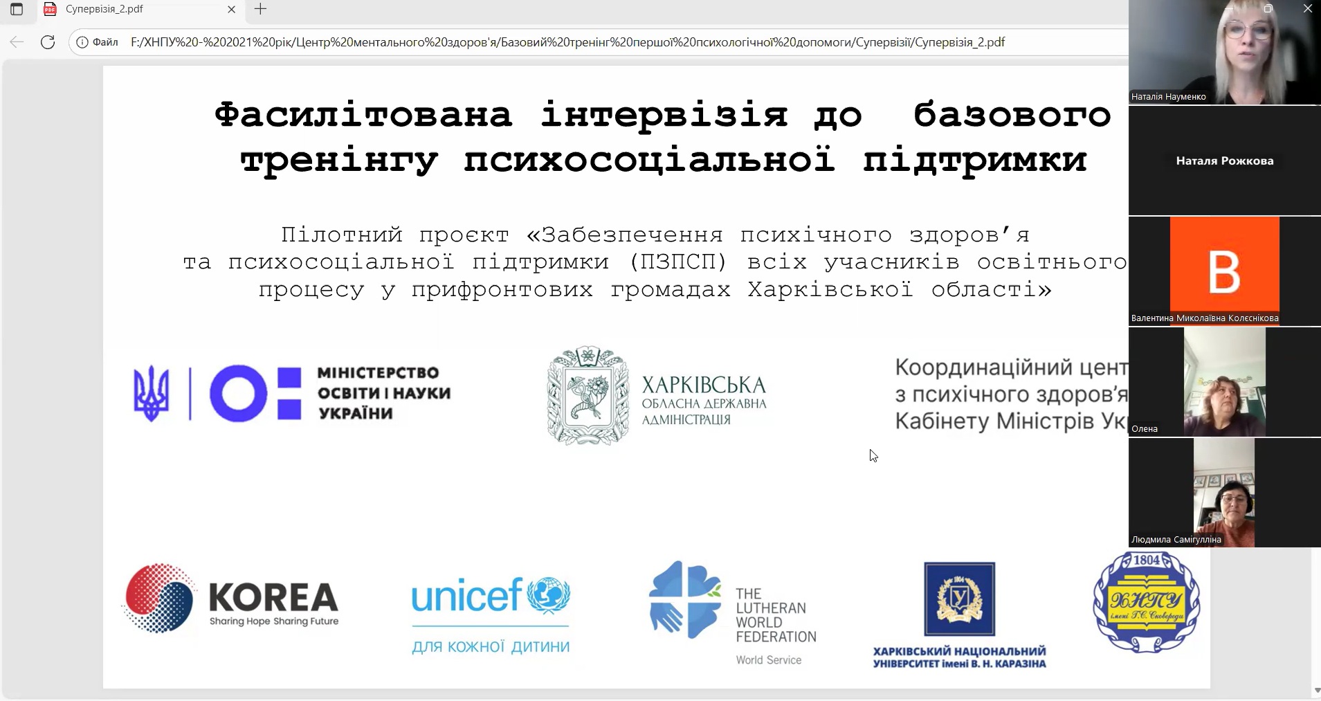 18 і 20 листопада 2025 року відбулася друга фасилітована інтервізія до базового тренінгу психосоціальної підтримки в межах пілотного проєкту «Забезпечення психічного здоровя та психосоціальної підтримки (ПЗПСП) всіх учасників освітнього процесу у прифронтових громадах Харківської області», що проходить за підтримки МОН України, Харківської обласної  військової адміністрації, Координаційного центру з психічного здоров’я Кабінету Міністрів України, ЮНІСЕФ, що фінансується Республікою Корея, а імплементує його Всесвітня Лютеранська Федерація в Україні, Харківського національного педагогічного університету імені Г.С. Сковороди.