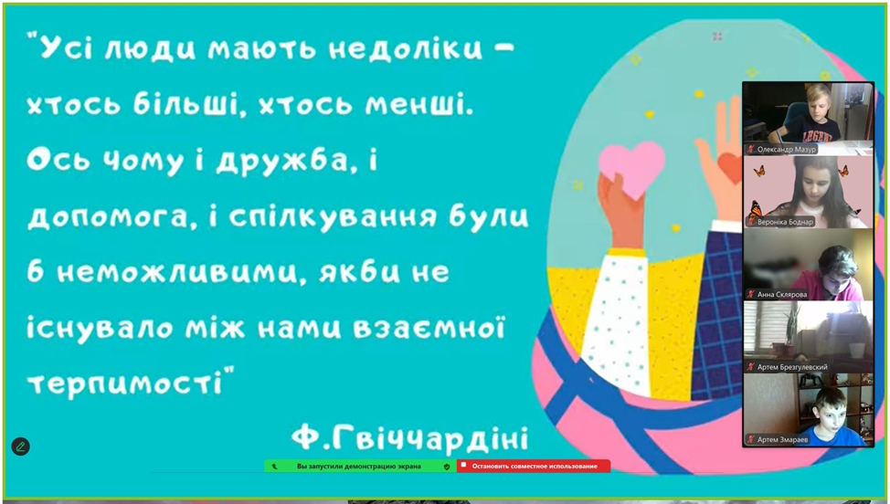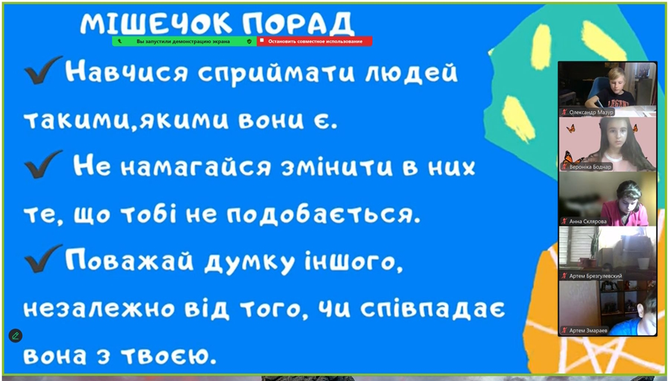 Протягом години запрошені учні, вчителі та інші фахівці закладів освіти м. Харкова та Харківської області дізналися про особливості застосування арттерапевтичної методики «Казкотерапія» в роботі практичного психолога, дефектолога та логопеда, та навчилися технології самостійного створювання різних видів казок для їх використання в професійній діяльності.