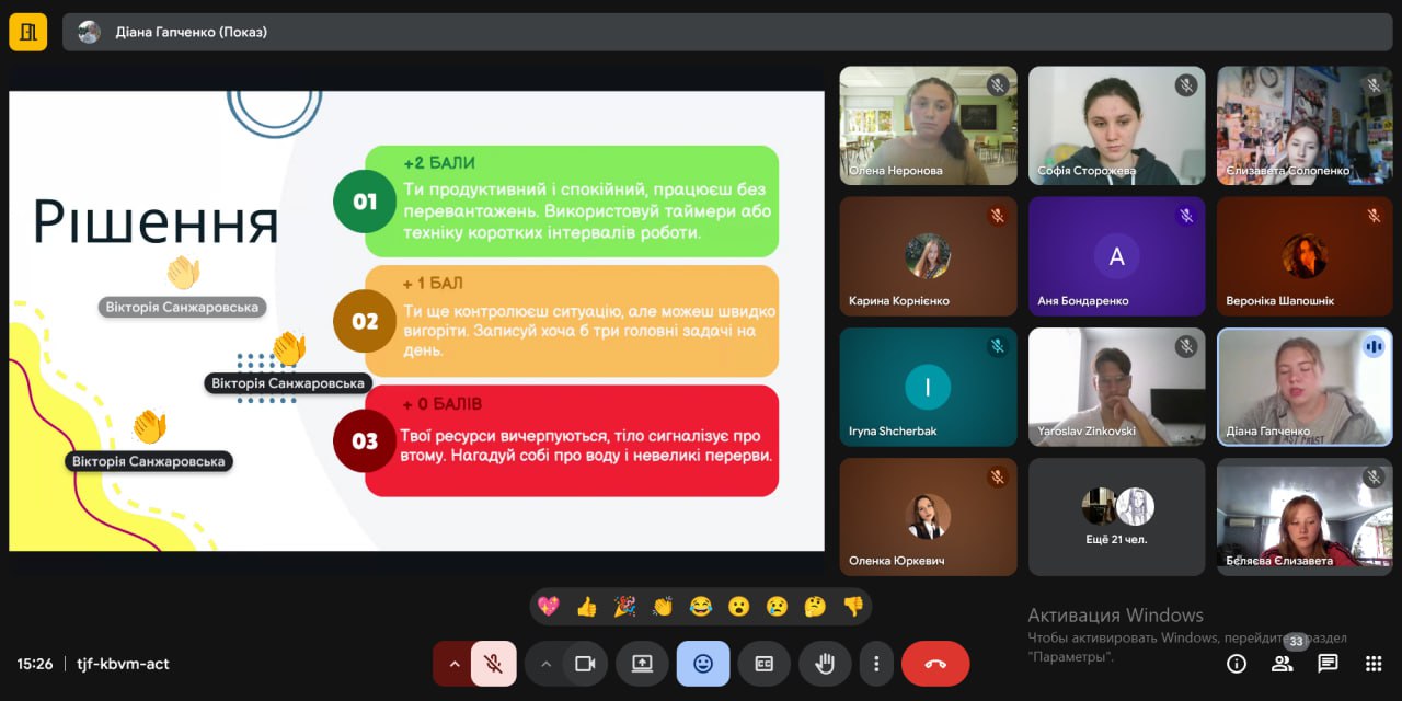 Під час засідання учасники активно долучилися до обговорення проблеми синдрому вигорання, ділилися власним досвідом і спостереженнями. Разом ми зруйнували міфи про вигорання, навчились його розпізнавати та обговорили способи запобігання, щоб зберігати енергію та психологічне здоров’я.