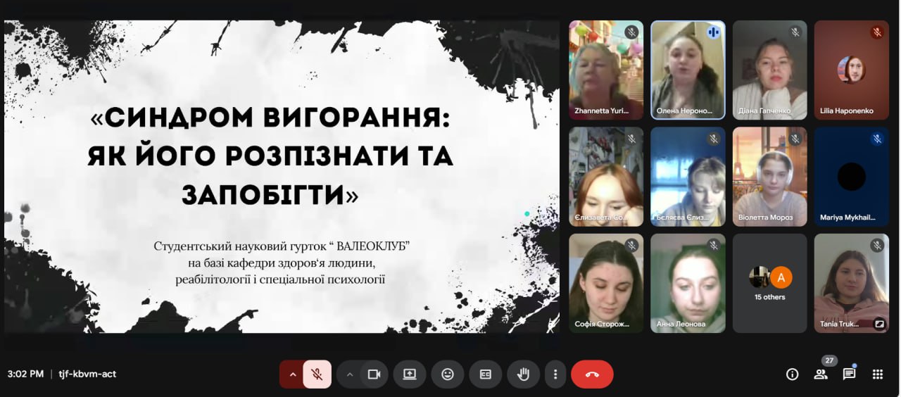 19 листопада 2025 року відбулося чергове засідання студентського наукового гуртка «ВАЛЕОКЛУБ» на тему: «Синдром вигорання: Як його розпізнати та запобігти». Вступне слово про вигорання в Україні  висловила керівник гуртка, кандидат педагогічних наук, доцент кафедри здоров'я людини, реабілітології і спеціальної психології Щербак Ірина Миколаївна.