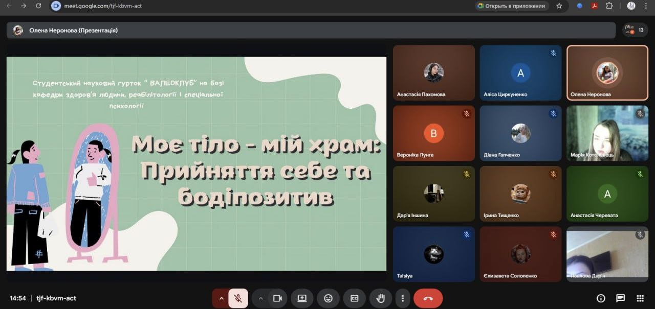 21 січня 2026 року відбулося чергове засідання студентського наукового гуртка «ВАЛЕОКЛУБ» на тему: «МОЄ ТІЛО – МІЙ ХРАМ». Вступне слово про прийняття свого тіла висловила керівник гуртка, кандидат педагогічних наук, доцент кафедри здоров'я людини, реабілітології і спеціальної психології Щербак Ірина Миколаївна.