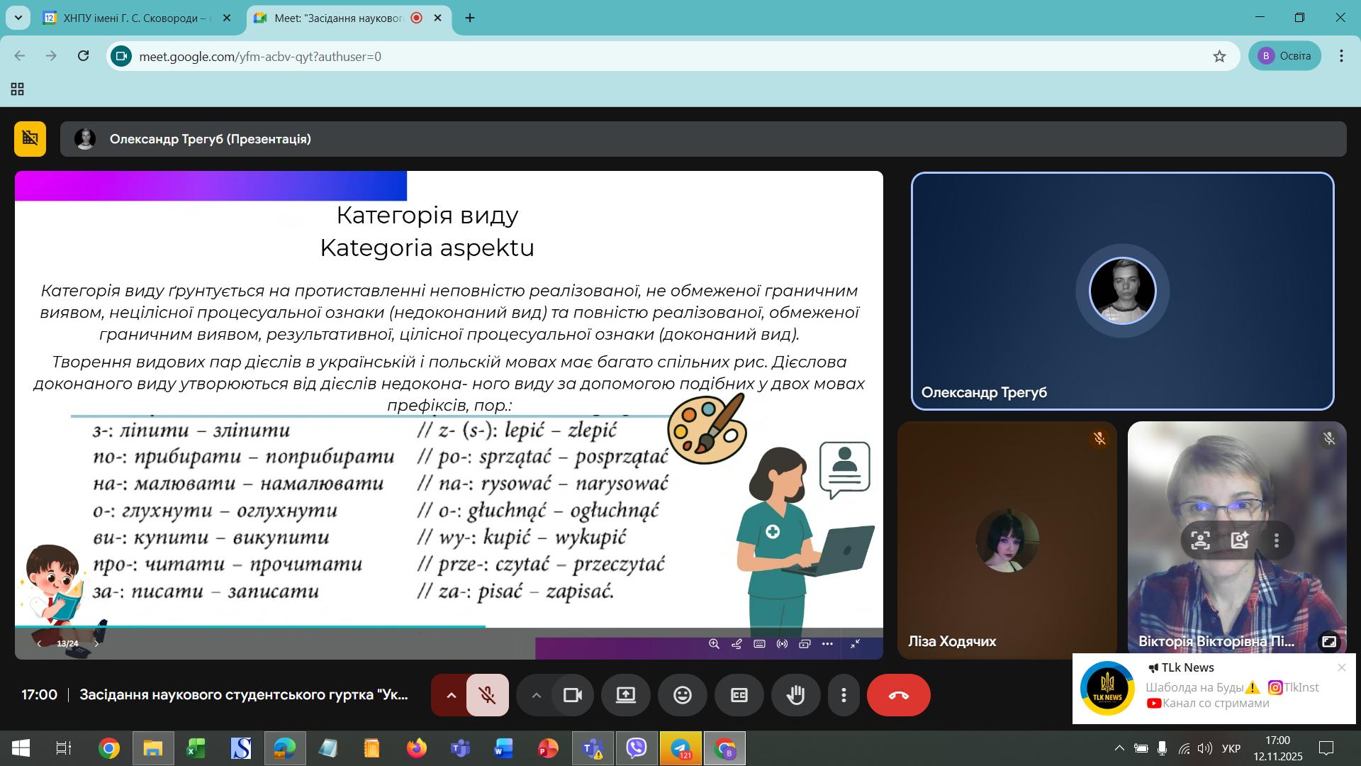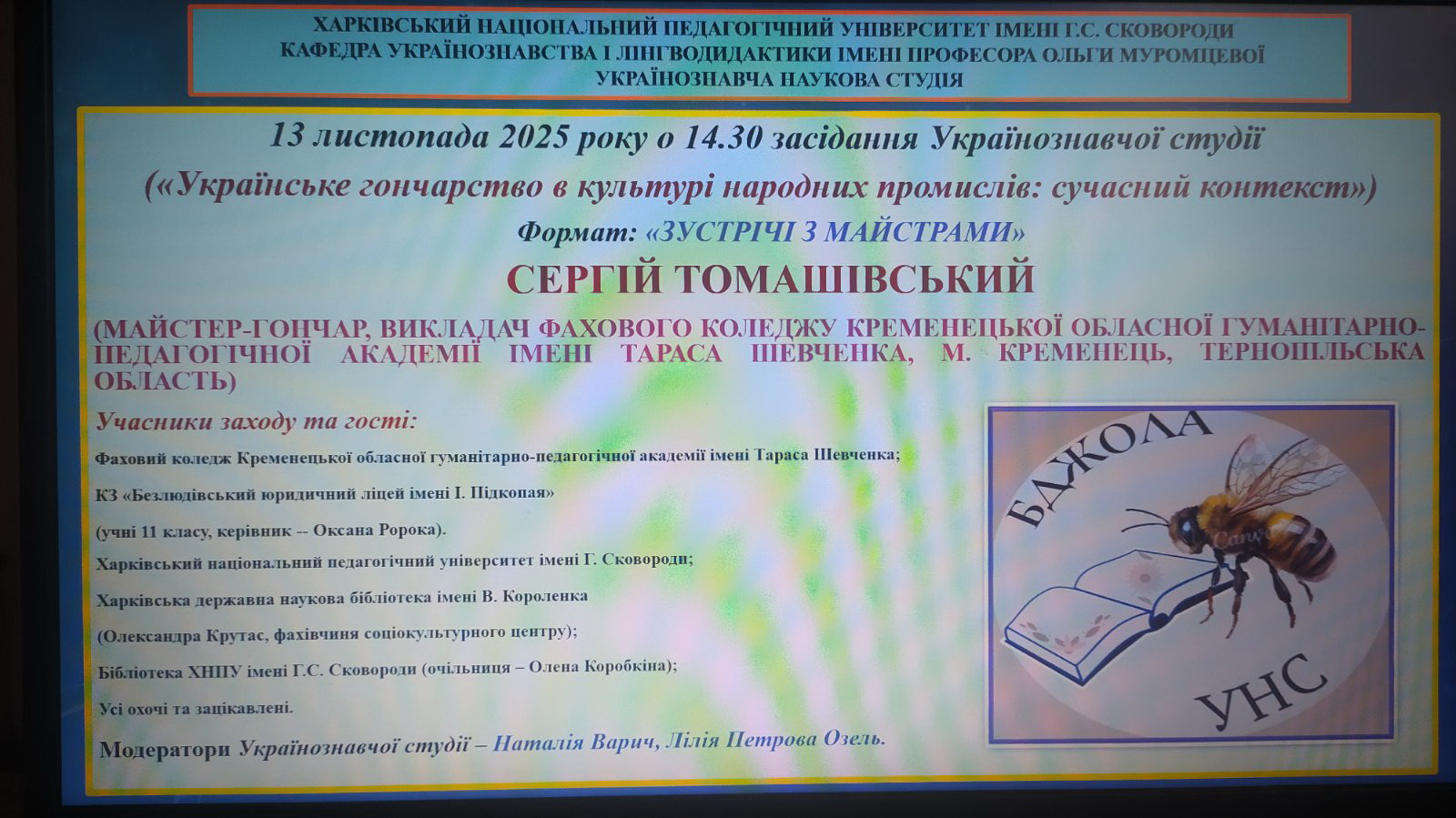 15 травня 2025 року на засіданні Українознавчої студії та в межах тижня науки студенти українського мовно-літературного факультету, факультетів історії й права, початкового навчання, дошкільної освіти ХНПУ імені Григорія Сковороди обговорювали актуальні проблеми сучасного українознавства з викладачами Сковородинівського університету, а також доктором філологічних наук, професором кафедри української мови і світової літератури Анатолієм Олександровичем Новиковим і студентами Глухівського національного педагогічного університету імені Олександра Довженка, кандидатом педагогічних наук, доцентом кафедри методики викладання природничо-математичних дисциплін у дошкільній, початковій і спеціальній освіті Людмилою Павлівною Старіковою, викладачами Тернопільського національного політехнічного університету імені Івана Пулюя, очільницею соціокультурного центру Харківської державної наукової бібліотеки імені В. Короленка Олександрою Крутас, учнями 10-В класу КЗ«Безлюдівський юридичний ліцей імені І. Підкопая» та вчителем української мови та літератури Оксаною Ророкою.