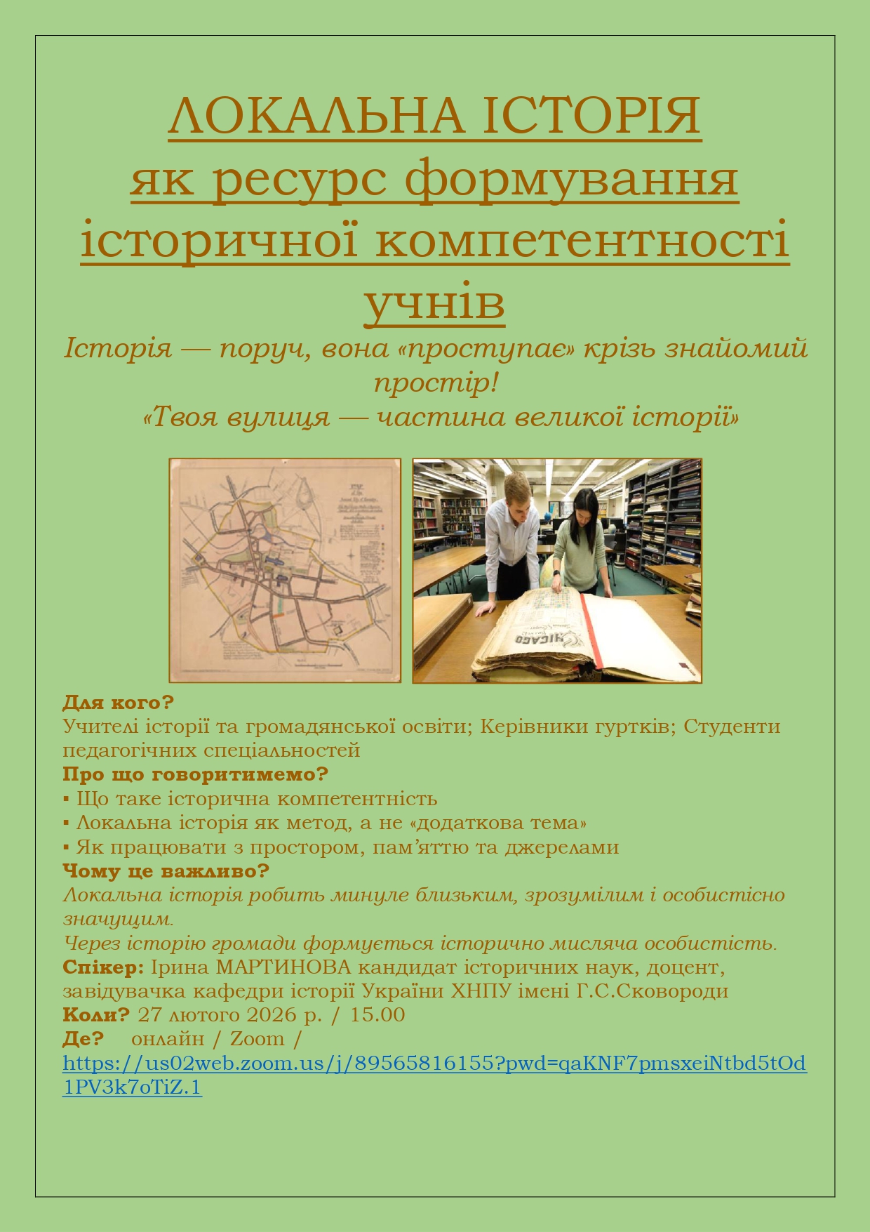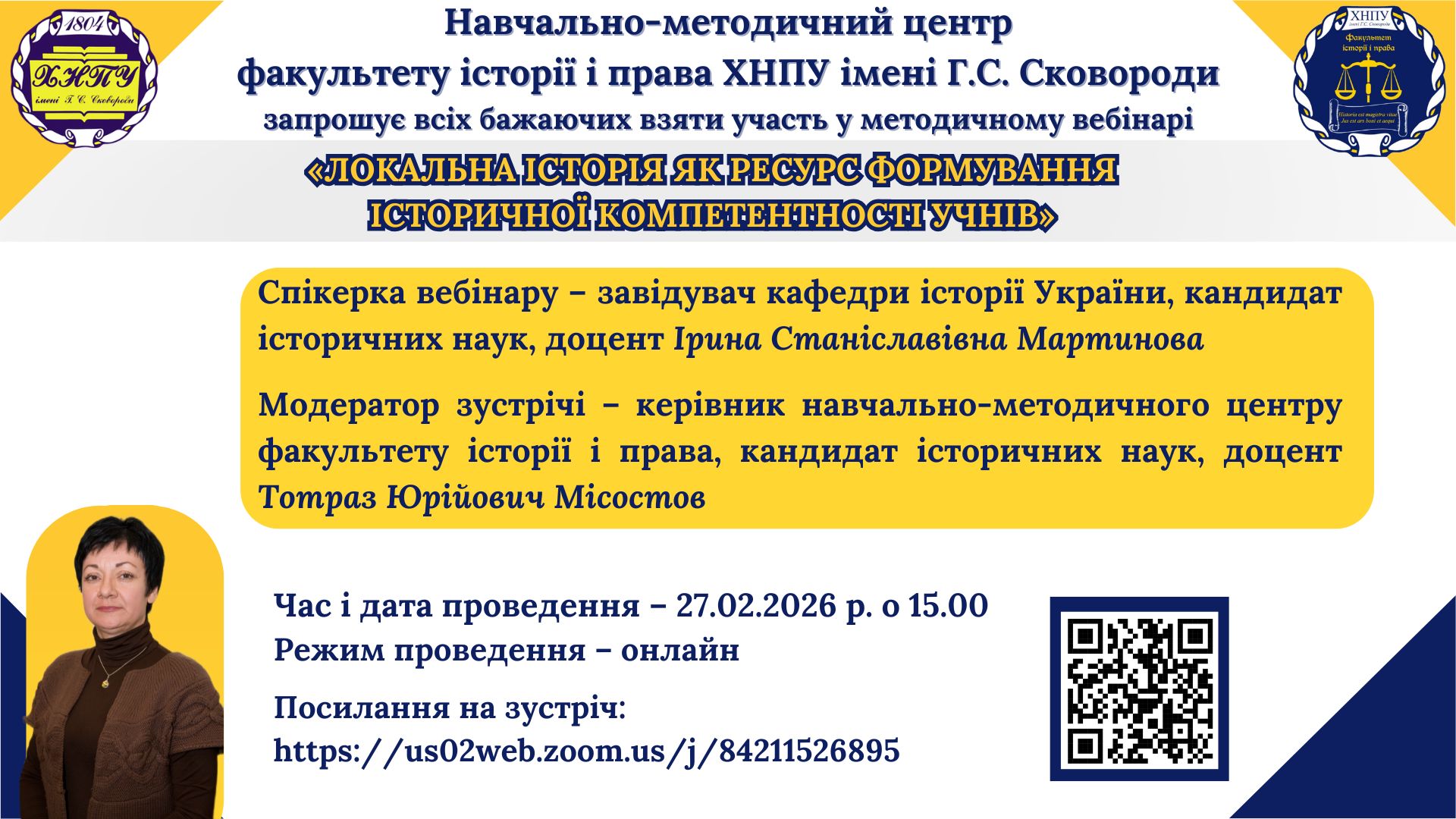 27 лютого 2026 р., на базі навчально-методичного центру факультету історії і права ХНПУ імені Г.С. Сковороди, спільно з науково-методичним центром університету, був проведений черговий методичний захід з циклу «Нові підходи у викладанні історії, правознавства, громадянської освіти та географії». Цього разу це був методичний вебінар на тему «Локальна історія як ресурс формування історичної компетентності учнів»