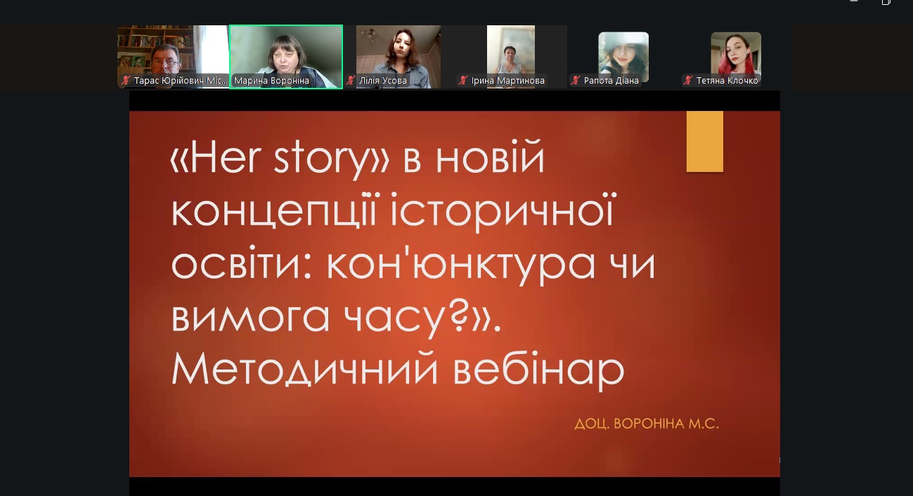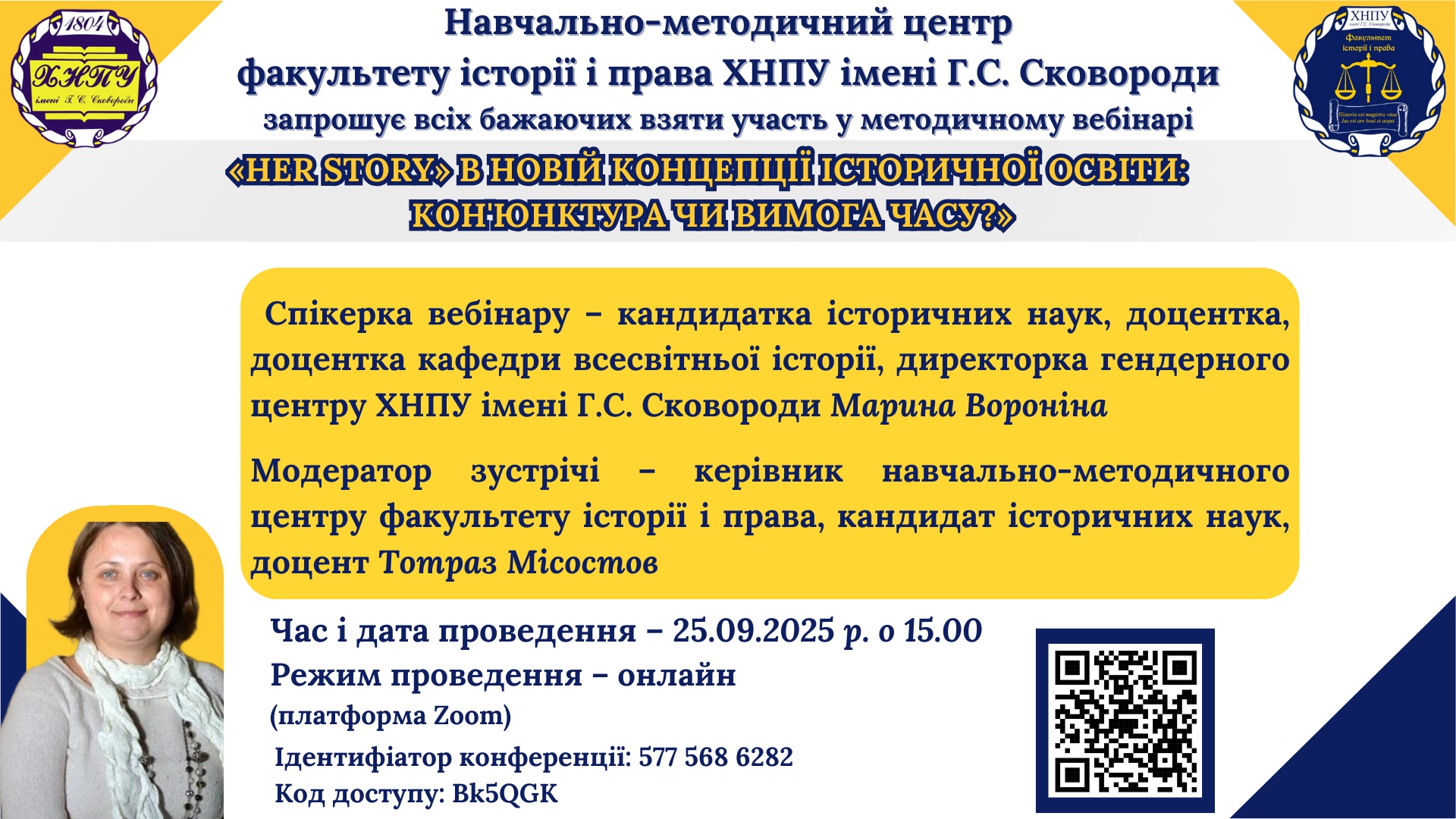 25 вересня 2025 року на базі навчально-методичного центру факультету історії і права було організовано і проведено перший у цьому навчальному році методичний вебінар з циклу «Нові підходи у викладанні історії, правознавства, громадянської освіти та географії». Спікеркою вебінару була запрошена директорка Гендерного центру ХНПУ імені Г.С. Сковороди, кандидатка історичних наук, доцентка, доцентка кафедри всесвітньої історії Марина Сергіївна Вороніна, яка презентувала цікаву й актуальну тему ««Her story» в новій концепції історичної освіти: кон'юнктура чи вимога часу?». Модератором заходу виступив керівник навчально-методичного центру факультету історії і права, кандидат історичних наук, доцент, доцент кафедри всесвітньої історії Тотраз Юрійович Місостов.