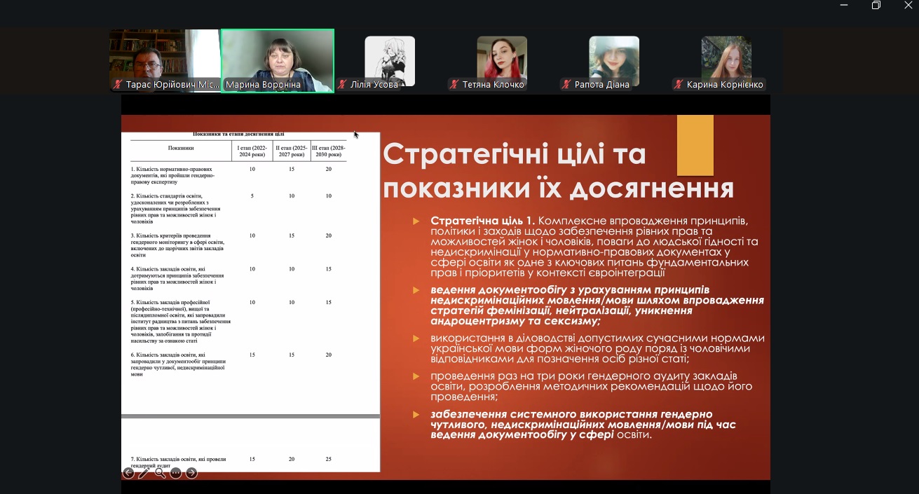 В своїй доповіді М.С. Вороніна зосередилася на розгляді таких питань:«Her story»? Яке місце «Her story»/фемінології/гендерної історії/історії фемінізму в концептуальних засад реформування історичної освіти в системі загальної середньої освіти? Як «Her story» допоможе нам в реалізації Стратегії впровадження гендерної рівності у сфері освіти до 2030 року? У чому відмінності реалізації Стратегії впровадження гендерної рівності у сфері освіти до 2030 року в закладах повної загальної середньої або вищої та післядипломної освіти? Використовуючи яскраву й змістовну презентацію з різноманітним ілюстрованим матеріалом з гендерної проблематики, Марина Сергіївна детально проаналізувала і надала розгорнуту інформацію стосовно всіх зазначених нею питань доповіді.