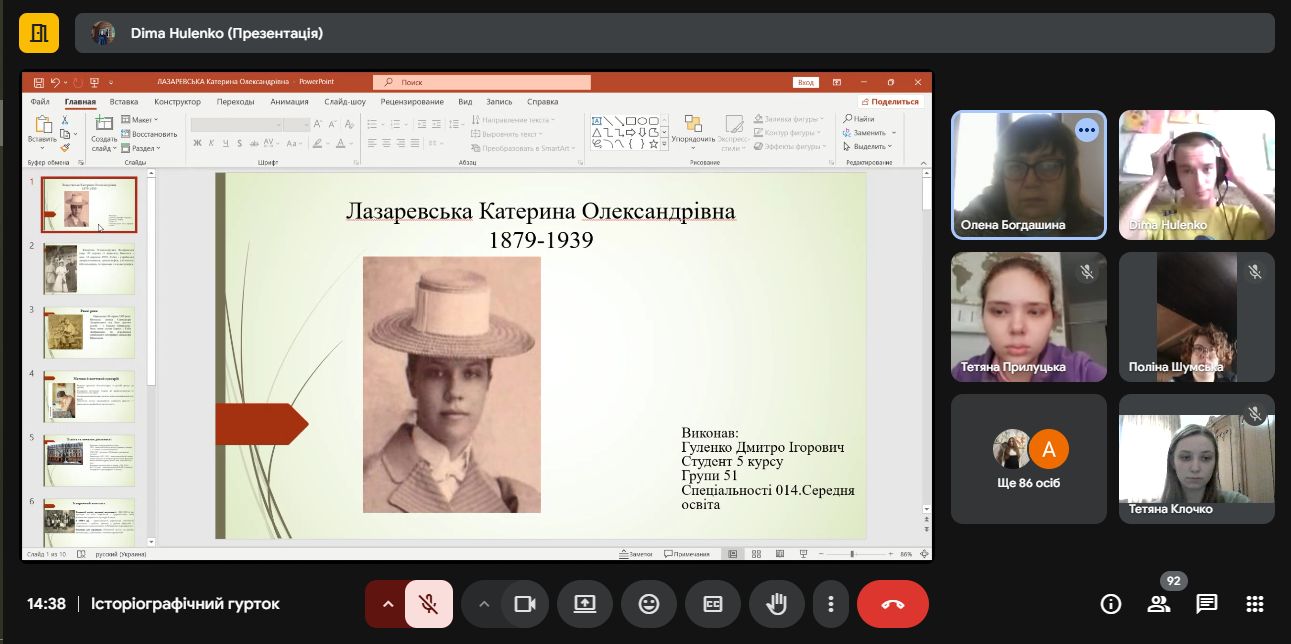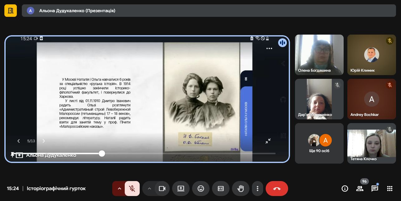 На цьому засіданні були присутня рекордна (більше ста) кількість здобувачів (студенти 1-5 к., аспіранти). З великим інтересом заслухали та обговорили доповіді магістрів-істориків про таких видатних науковиць як К.О.Лазаревська (Дмитро Гуленко), К.М.Грушевська (Вадим Дегтярьов), О.Д.Багалій-Татарінова (Альона Дудукаленко), О.Я.Єфименко (Олексій Мельничук), О.Г.Водолажченко та Н.Ю.Мірза-Авакянц (Андрій Бочкар), Н.Д.Полонська-Василенко (Марія Максимова). Численні фотографії в усіх презентаціях унаочнювали висловлені доповідачами факти з біографій видатних українок.