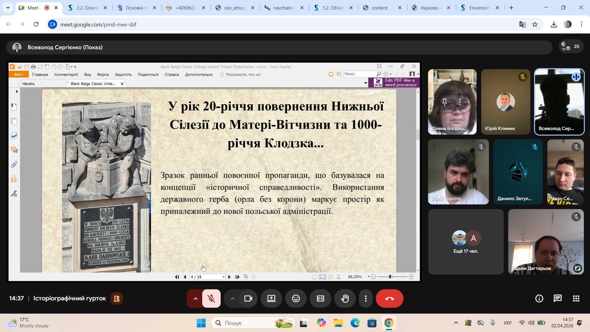 Аспірант 3 курсу Всеволод СЕРГІЄНКО у доповіді «Реполонізація Сілезії після 1945 року» показав зіткнення державної політики з ідентичністю корінного населення. Аспірант розповів про методи «боротьби з німцями» ‒ від примусової зміни імен до очищення цвинтарів. Попри адміністративний тиск приватна пам’ять і опір громади стали визначальними факторами в історії повоєнної Сілезії.