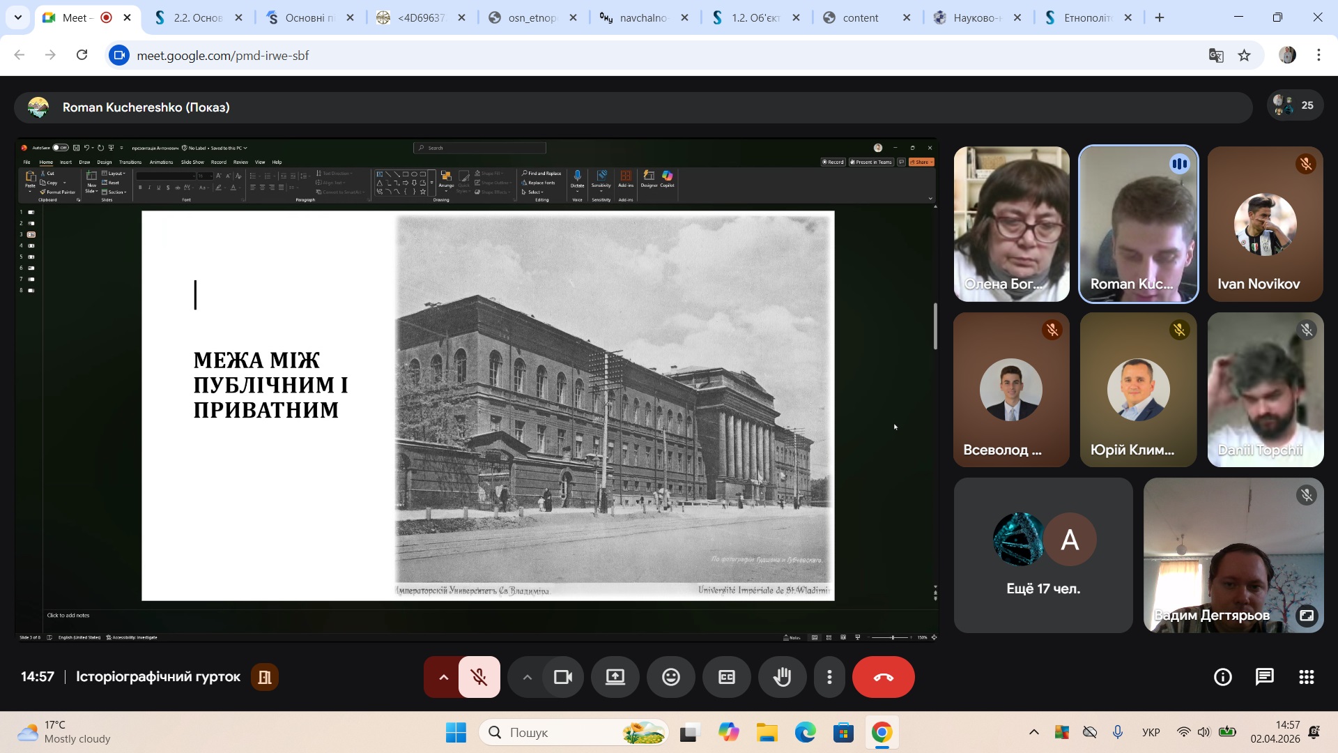 2 квітня 2026 р. під керівництвом доктора історичних наук, професора, професора кафедри історії України, гаранта ОНП В9 «Історія та археологія» Олени БОГДАШИНОЇ відбулося чергове засідання історіографічного гуртка. На засіданні були присутні студенти різних факультетів та аспіранти спеціальності В9 «Історія та археологія».