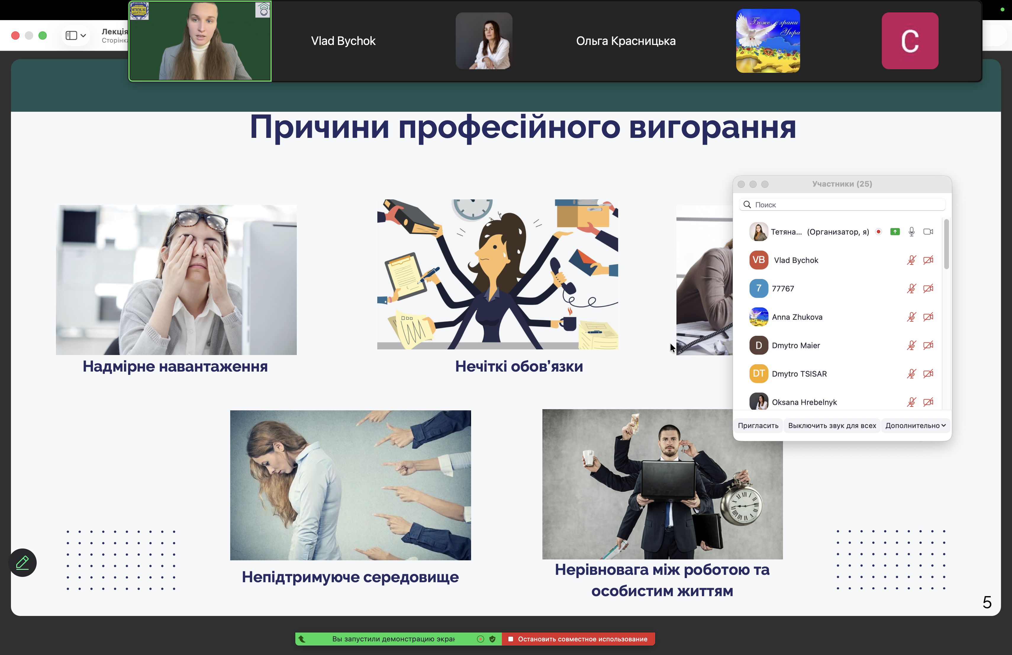 Під час лекції Тетяна Сергіївна детально розкрила поняття професійного вигорання, зупинилася на його основних причинах та перших ознаках, а також поділилася ефективними стратегіями запобігання емоційному виснаженню.