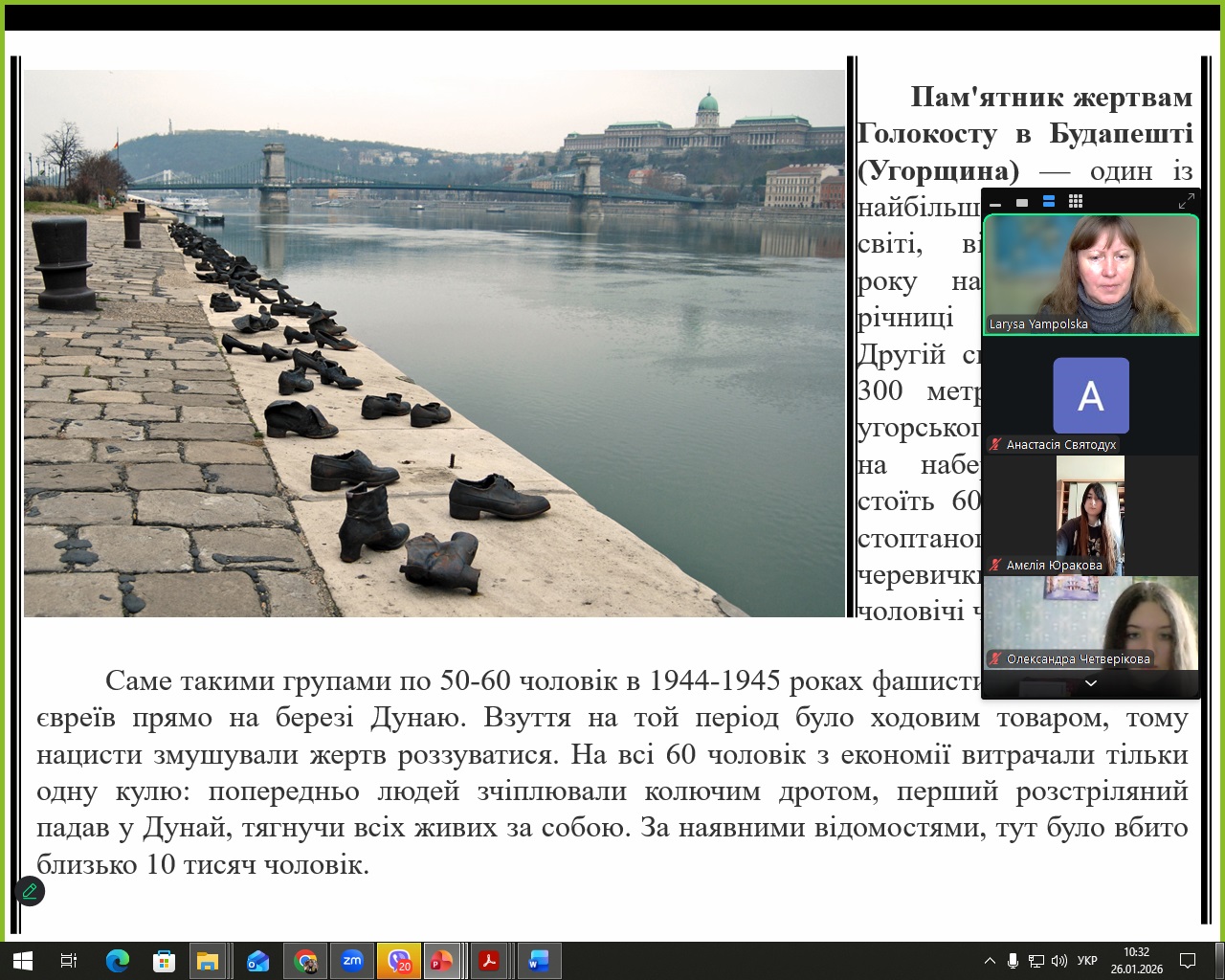 Аналіз передумов і наслідків Шоа у поєднанні з акцентом на цінності людського життя допоміг молоді краще зрозуміти масштаб катастрофи та важливість збереження історичної правди. Під час заходу десятикласники мали змогу не лише почути факти про геноцид, а й долучитися до дискусії про толерантність, моральний вибір і недопущення подібних злочинів у майбутньому. Особливу увагу було приділено трагедії Бабиного Яру в Україні, де у 1941-1943 рр. загинуло понад 100 тис. людей, та повстанню у таборі смерті «Собібор» у жовтні 1943 р. Учні ознайомилися з історією меморіальних комплексів у Берліні, Будапешті, Єрусалимі, що дозволило усвідомити масштаб катастрофи, яка забрала життя 6 млн євреїв Європи. Використання візуальних джерел допомогло старшокласникам осягнути важливість захисту людської гідності та протидії будь-яким проявам ненависті в сучасному світі.