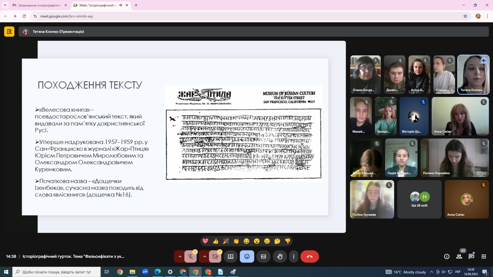 Перше засідання історіографічного гуртка у новому навчальному році було присвячене відомим фальсифікатам української історії. У вступному слові проф. О.М. Богдашина наголосила, що на цьому засіданні ми ознайомимося не лише з сфальшованими історичними джерелами, а й навпаки - зі справжніми документами, які були оголошені підробкою (таємний протокол до пакту Молотова-Ріббентропа). Наприклад, карту з пропозиціями щодо кордонів від делегації УНР на Паризькій мирній конференції 1919 р. деякі сучасні популяризатори помилково представляють як реальні кордони держави. До того ж ряд дослідників редагували документи у потрібному для публікатора дусі з додаванням вигаданих фактів тощо. Сприйняття художнього слова як історичного факту, некритичне сприйняття хибодруків також приводять до поширення неправдивої інформації. Присутні представники різних факультетів з великим інтересом заслухали доповіді студентів 4 к. Тетяни Клочко, Аліни Черкашиної, Надії Федоренко про «Влесову книгу», «Слово о полку Ігоревім», Татіщевську колекцію, карту УНР 1919 р., протоколи Комінтерну, таємний протокол до пакту Молотова-Ріббентропа 1939 р., інші джерела.