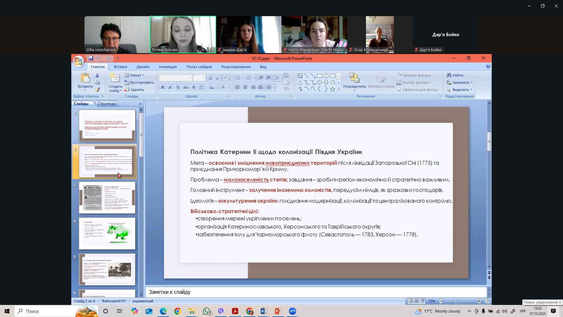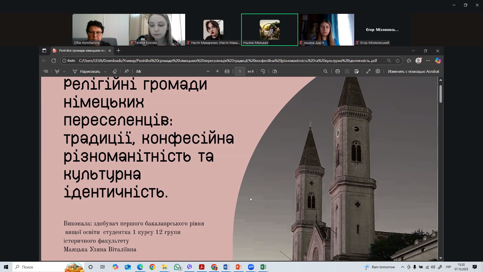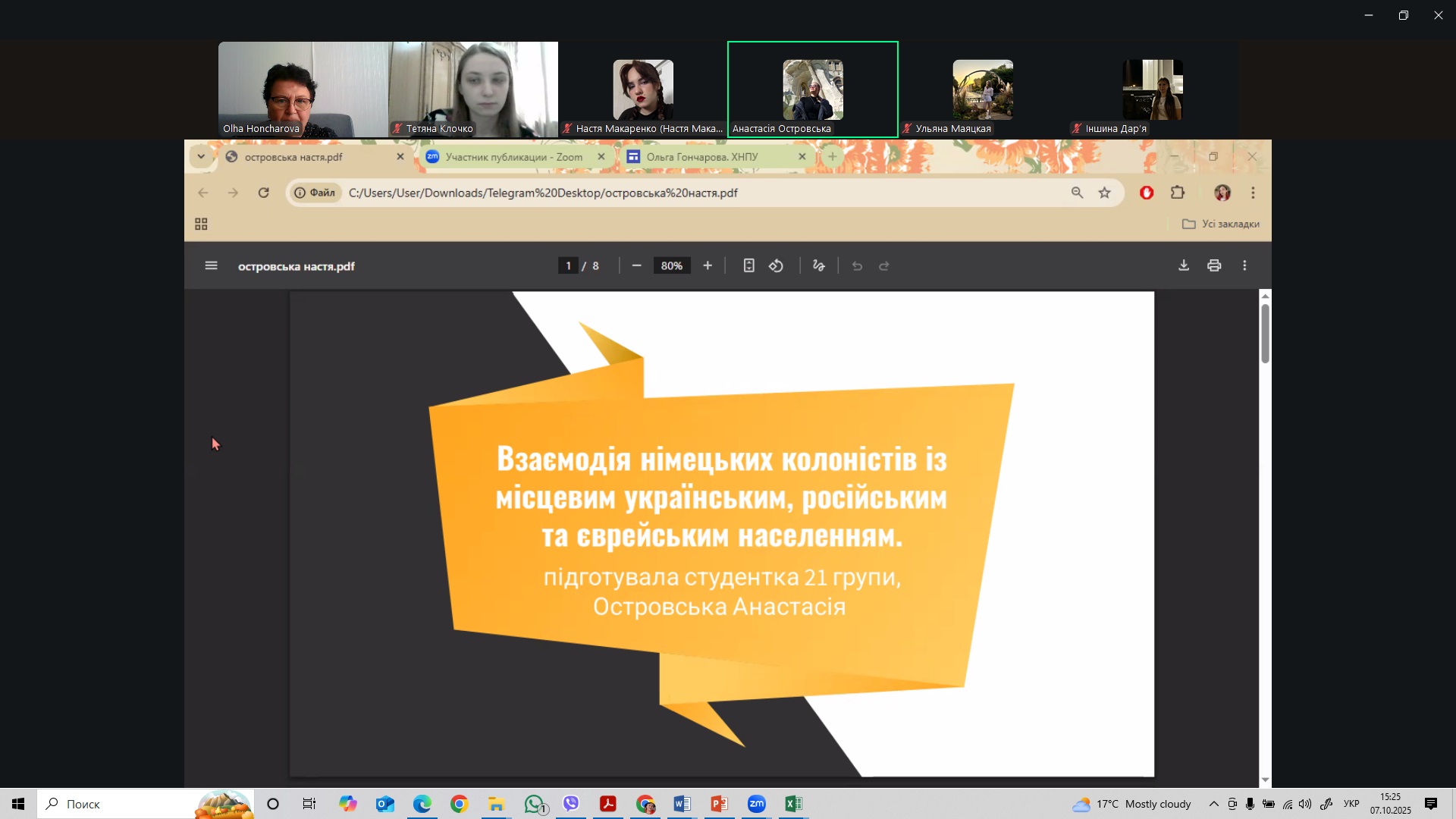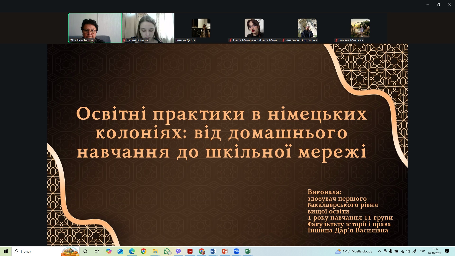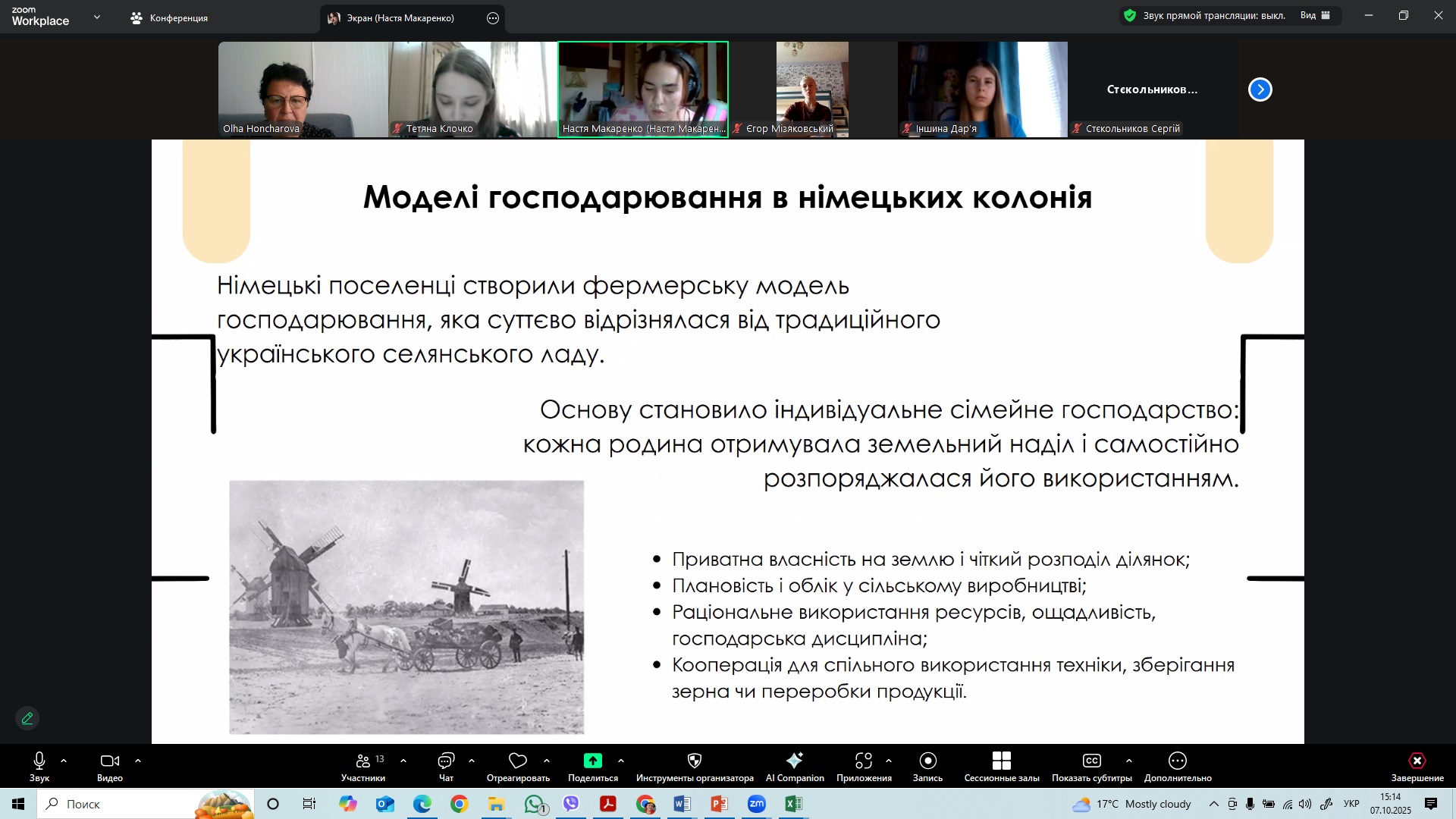 07 жовтня 2025 року відбулося чергове засідання студентського наукового гуртка етнічної історії України, керівництво яким здійснює кандидат історичних наук, доцент, доцент кафедри історії України Гончарова Ольга Сергіївна. Тема засідання: Німецькі колоністи в Україні: економічний і культурний внесок (до річниці початку масового переселення німців у Південну Україну 1780-х рр. Серед учасників гуртка – здобувачі вищої освіти першого (бакалаврського) та другого (магістерських) рівнів спеціальності 014.03 Середня освіта (Історія) факультету історії і права. Гуртківцями було підготовлено та успішно представлено доповіді на наступні теми: Політика Катерини ІІ та початки масового переселення німців у Південну Україну в 1780-х рр. та Німецькі колоністи як рушії розвитку аграрної економіки Півдня України (Клочко Тетяна Павлівна, 4 курс, 41 група); Моделі господарювання та землеробські інновації в німецьких колоніях (Макаренко Анастасія Сергіївна, 3 курс, 31 група); Релігійні громади німецьких переселенців: традиції, конфесійна різноманітність та культурна ідентичність (Маяцька Уляна Віталіївна, 1 курс, 12 група); Взаємодія німецьких колоністів із місцевим українським, російським та єврейським населенням (Островська Анастасія Андріївна, 2 курс, 21 група); Освітні практики в німецьких колоніях: від домашнього навчання до шкільної мережі (Іншина Дар'я Василівна, 1 курс, 12 група); Архітектурна та побутова спадщина німецьких переселенців у Південній Україні. (Стєкольников Сергій Олексійович, 3 курс, 31 група); Промислові ініціативи німців-колоністів: пивоваріння, виноградарство, ремесла (Бойко Дар'я Сергіївна, 2 курс, 21 група); Культурний трансфер: як німці інтегрували європейські традиції в українське середовище (Півень Сергій Анатолійович, 3 курс, 31 група); Доля німецьких колоністів у ХХ столітті: репресії, депортації та спадщина пам’яті (Скоков Гліб Ігорович, 3 курс, 32 група)
