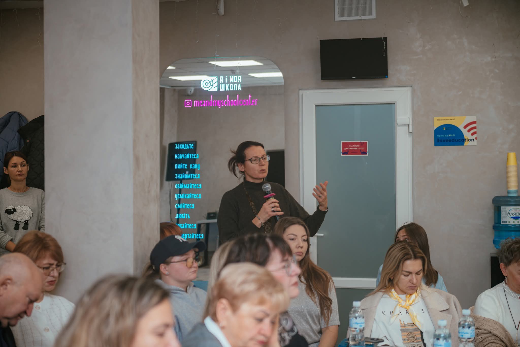 Розробниця - Оксана Гріга розповіла про ідею та історію створення гри "Безпечний простір", а потім запустила гру на платформі "Кахут". Учасниці та учасники знайомилися з етапами та завданнями гри, які стосувалися тем лукізму, бодішеймингу, форм насильства тощо.