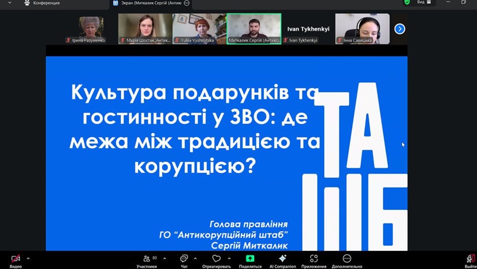 5 березня викладачі університету та кафедри в якості учасників проєкту «Антикорупція та доброчесність: трансформація середовища ЗВО» відвідали онлайн-зустріч з представниками НАЗК, присвячену культурі подарунків та гостинності в університеті.