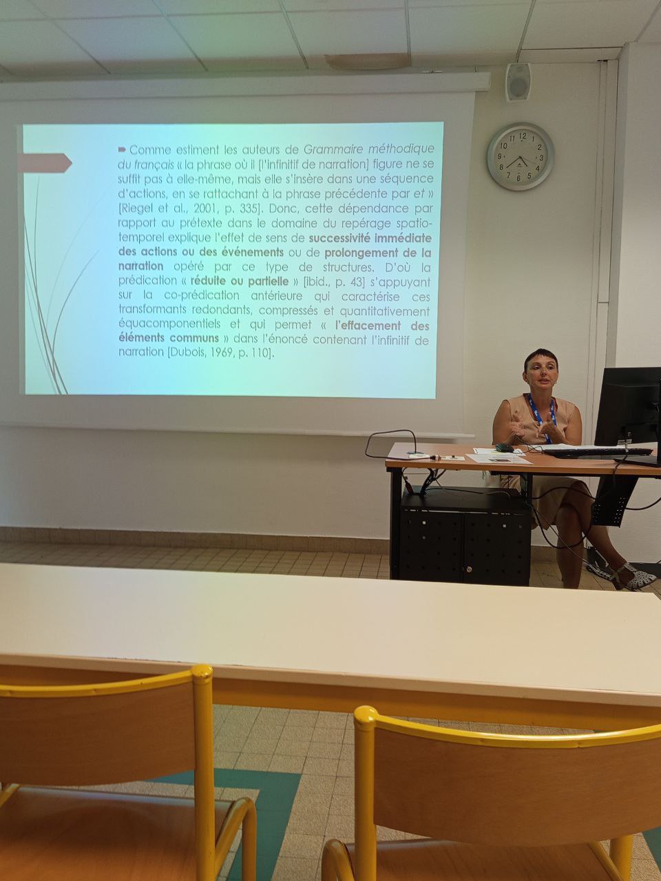У межах конгресу наша колега відвідала цікаві майстерні з креативного письма, з роботи з карикатурами, із синтаксичним структурами, з жестами та мімікою у процесі навчання французької мови тощо, послухала доповіді з лінгвістики, літератури, методики викладання французької мови та взяла активну учать в їхньому обговоренні. Вона також представила доповідь на тему «Наративний інфінітив у сучасній французькій художній прозі: фікція чи реальність?», що була високо оцінена вченими-мовознавцями з різних країн, які ставили доречні запитання стосовно частотності вживання таких конструкцій у творах французьких письменників ХХІ століття, наявності цієї теми в курсі лекцій з теоретичної граматики тощо.