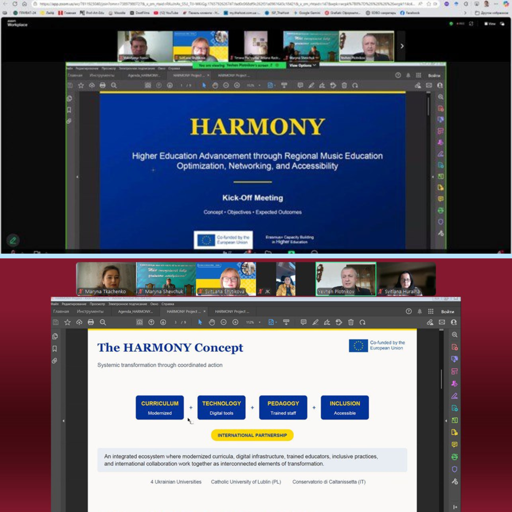 Також були презентовані інституції, які беруть участь у реалізації проєкту HARMONY – НДУ імені Миколи Гоголя, Katolicki Uniwersytet Lubelski Jana Pawła II (Lublin, Rzeczpospolita Polska), Istituto Superiore di Studi Musicali «Vincenzo Bellini» (Caltanissetta, Repubblica Italiana), Кременецька обласна гуманітарно-педагогічна академія імені Тараса Шевченка, ХНПУ імені Г. С. Сковороди, Ізмаїльський державний гуманітарний університет – та їх проєктні команди. Потужні напрацювання Сковородинівського університету в сфері міжнародної освітньої і науково-дослідницької співпраці, а також яскраві творчі і наукові здобутки спеціальності «Середня освіта. Музичне мистецтво» представила кандидат педагогічних наук, доцент кафедри музичного мистецтва, координатор з наукової роботи факультету мистецтв Марина ТКАЧЕНКО.