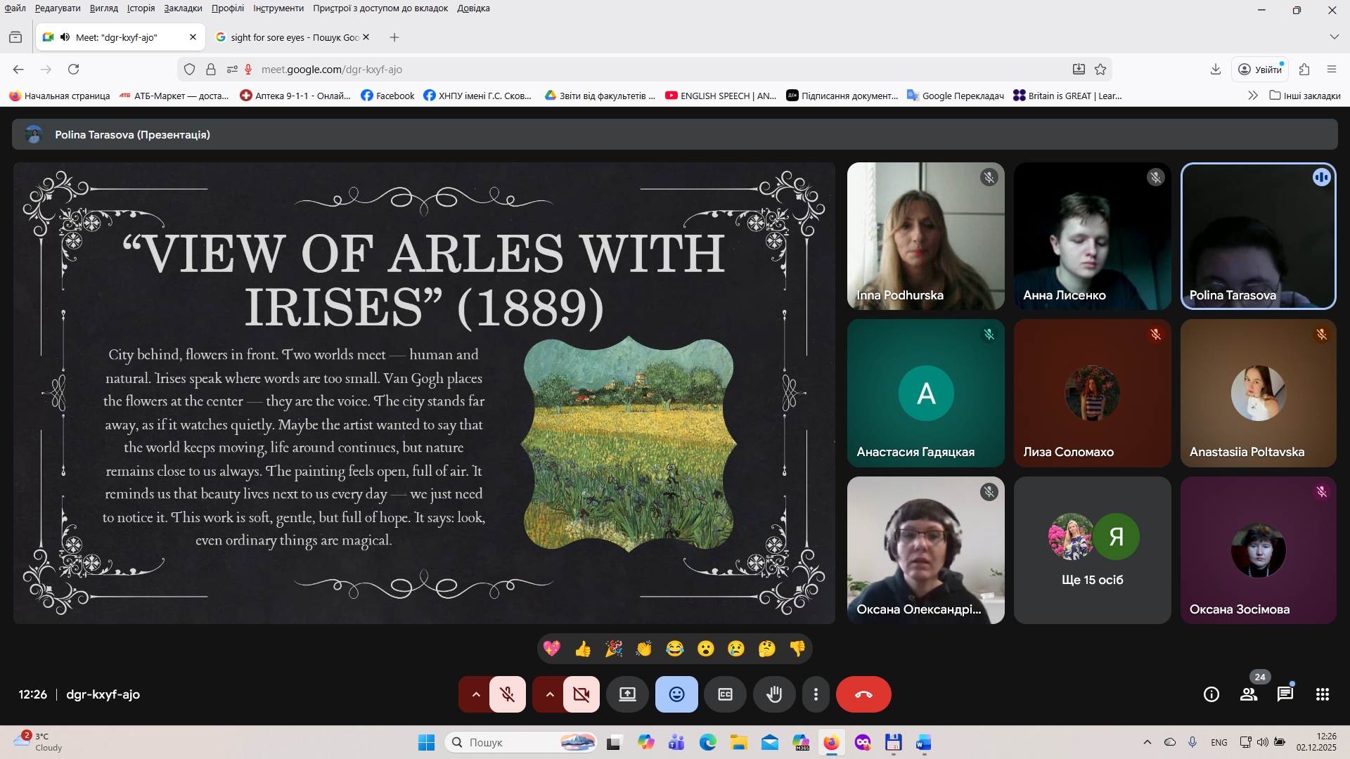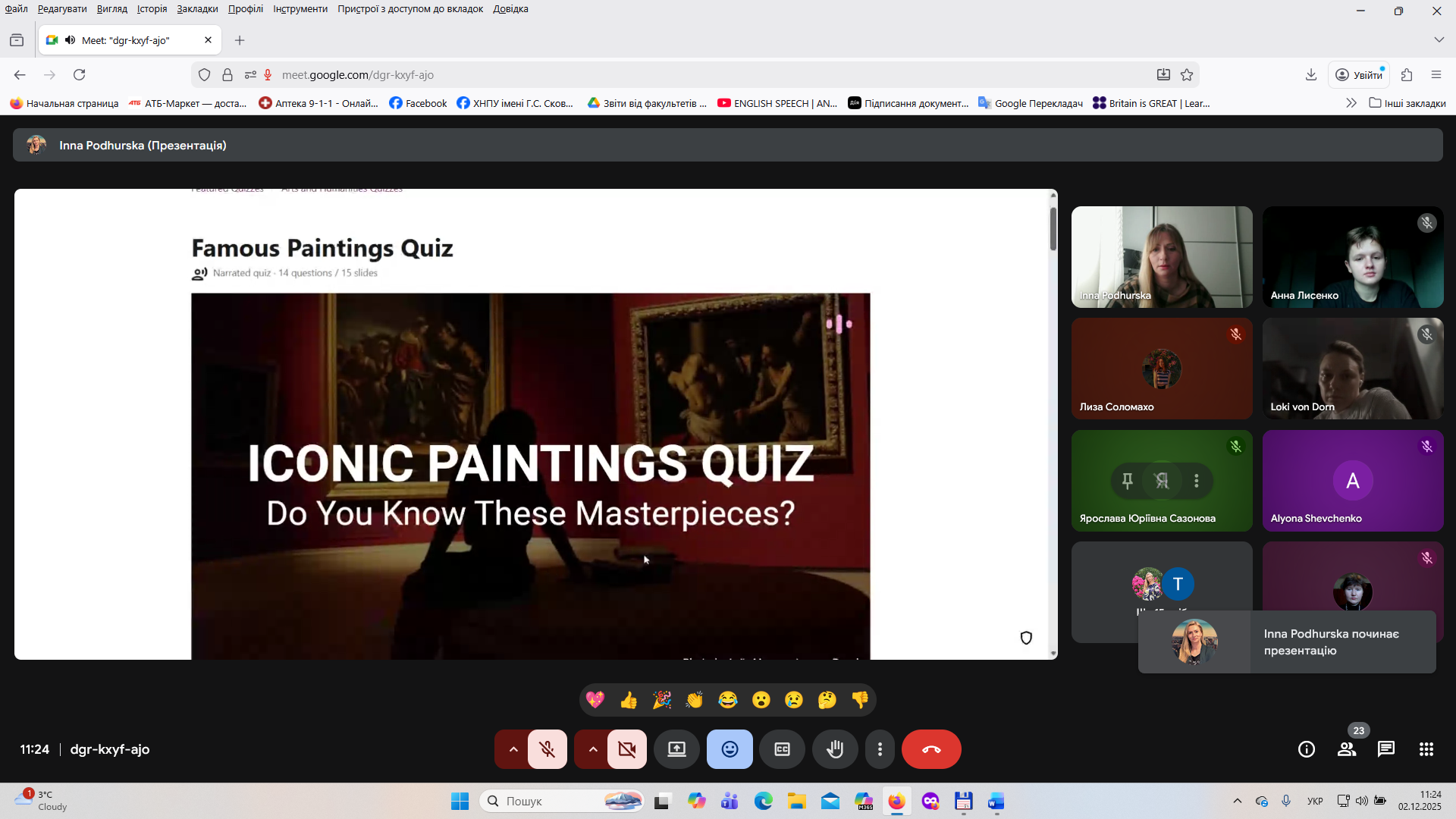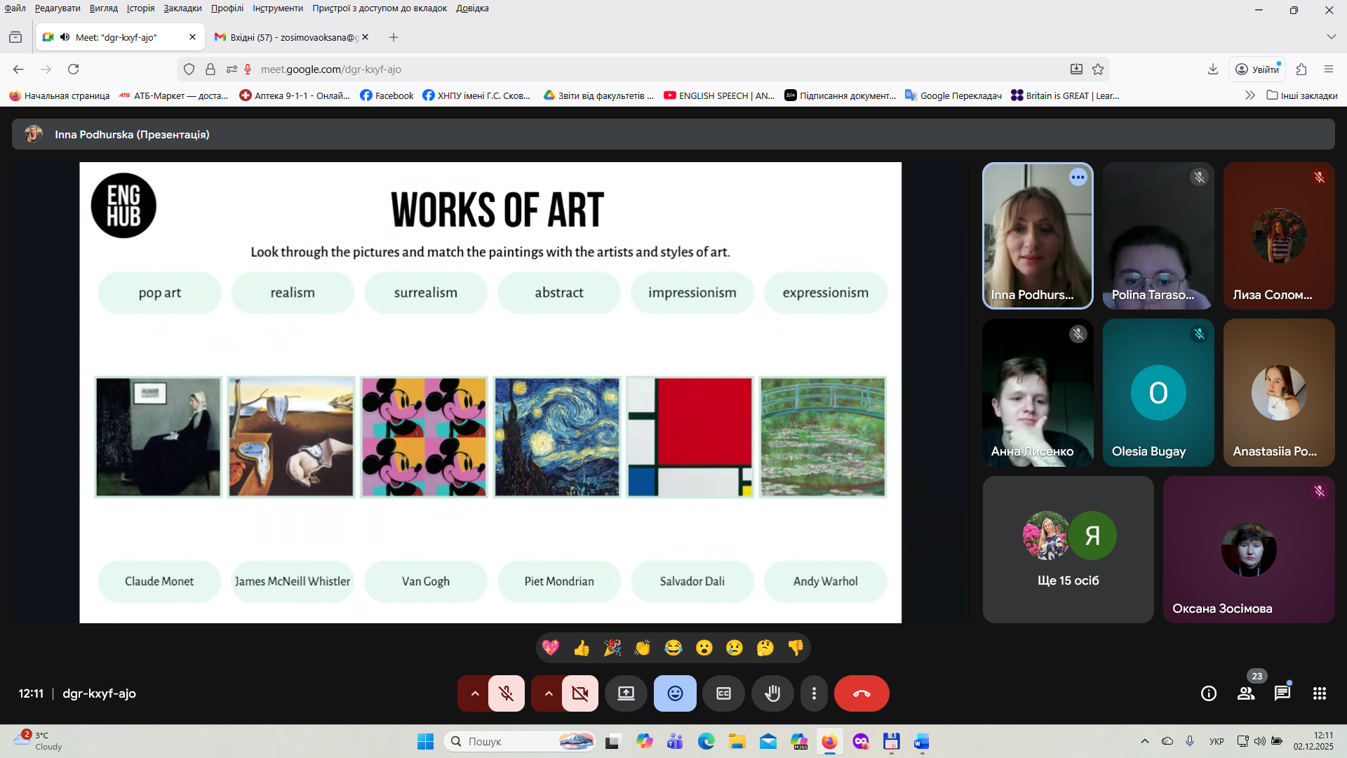 Завдяки використанню сучасних засобів навчання, яскравій наочності й теплій атмосфері спілкування та взаємодії, викладач разом зі студентами дала можливість присутнім зануритися у світ мистецтва, краси й творчого пошуку. Захопливі онлайн-вікторини і вправно організовані комунікативні завдання дозволили студентам вдосконалити вміння усного мовлення, повторити лексику з теми “Art”, звернути увагу на вимову певних слів, продемонструвати свою ерудицію, спостережливість та уважність, диференціюючи різні мистецькі стилі й індивідуальну манеру художників різних країн і напрямків.