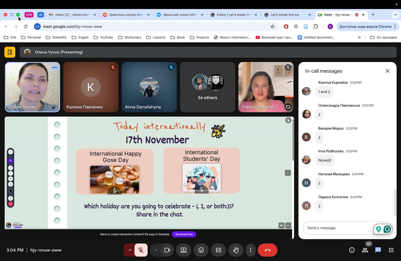 26.04.2023 відбулося засідання клубу English Speaking Club for the First-Year Students під керівництвом к.п.н., доцента Олени Валеріївни Єгорової. Темою чергового заходу стало «Talents and Hobbies». Учасники та учасниці клубу продемонстрували свої хоббі та взяли участь у жвавих дискусіях, підготували влоги та презентації з результатами своїх талантів.