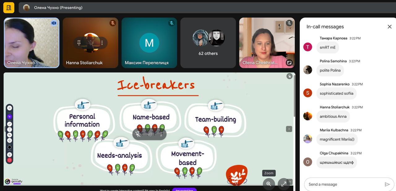 Під час першого вебінару, «Zero-Prep Ice-Breakers and Warm-ups», спікери продемонстрували, як перетворити рутинний початок уроку на захопливий інтерактив без використання складних презентацій. Учасники розглянули техніки, які допомагають студентам позбутися мовного бар’єру вже з перших хвилин заняття. Особливу увагу приділили адаптації вправ під онлайн та офлайн формати.