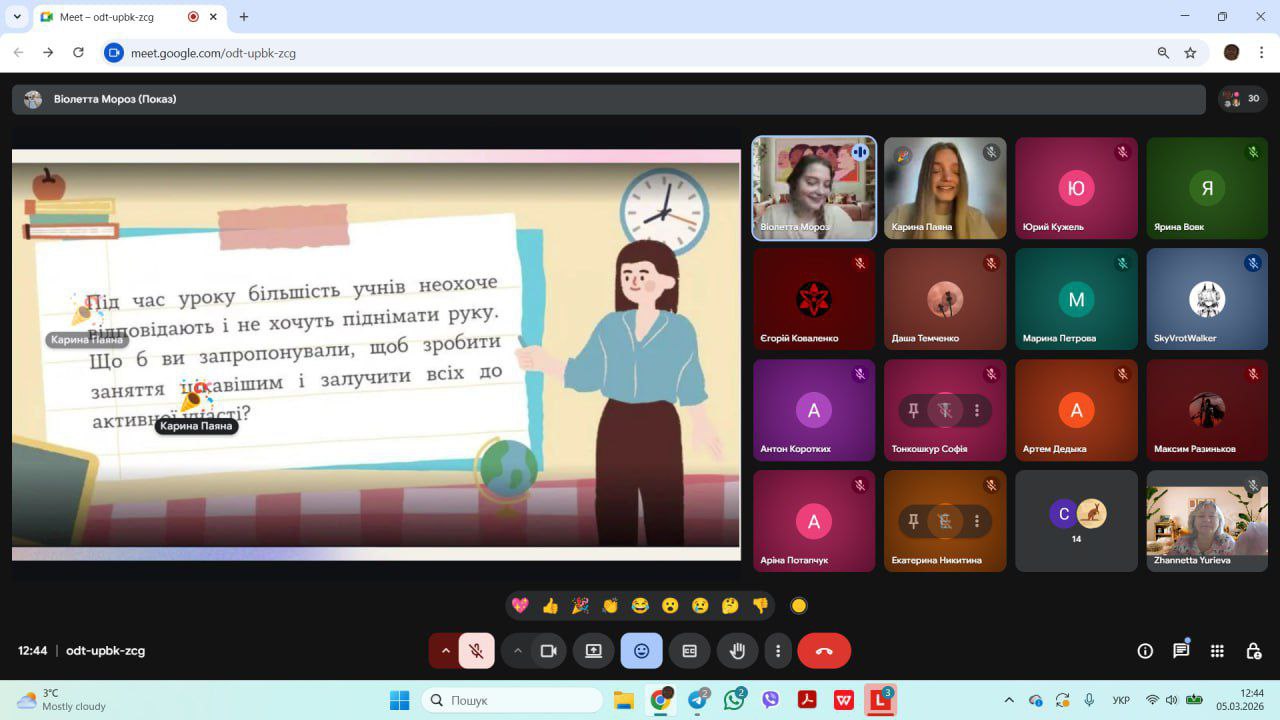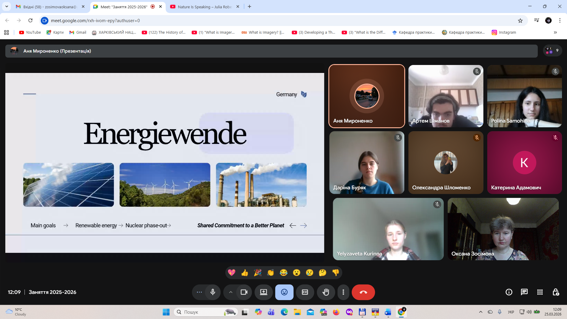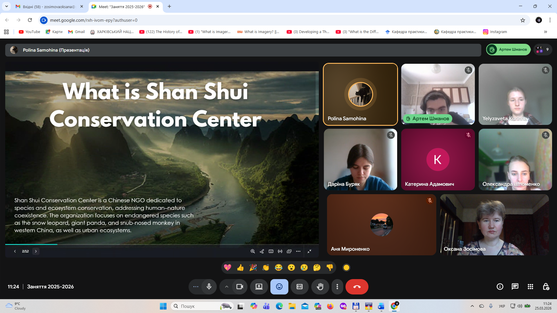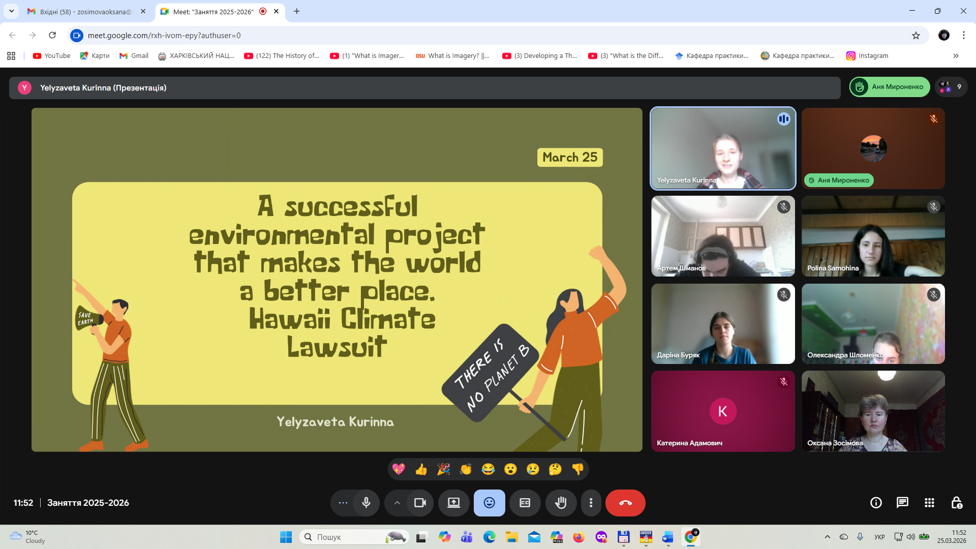 З метою формування екологічної культури та дбайливого ставлення до довкілля 25 березня 2026 р. завідувач кафедри практики англійського усного і писемного мовлення Оксана Віталіївна Зосімова разом зі здобувачами першого (бакалаврського) рівня вищої освіти 3-го року навчання факультету іноземної філології провела традиційний щорічний захід на тему “Successful Environmental Projects That Make the World a Better Place.” У формі онлайн-презентацій студенти представили успішні закордонні й українські проєкти, реалізація яких сприяла покращенню екологічної ситуації в різних куточках нашої планети. Проєкти охоплювали широке коло актуальних проблем, зокрема необхідності збереження рідкісних видів тварин, відновлення лісів, використання відновлювальних джерел енергії (сонця, вітру й біопалива), боротьби із пластиковим забрудненням водойм, питання ефективності застосування юридичних інструментів захисту довкілля тощо. У презентаціях було акцентовано увагу на тому, яким чином цей досвід може бути ефективно використаний у нашому регіоні та країні.