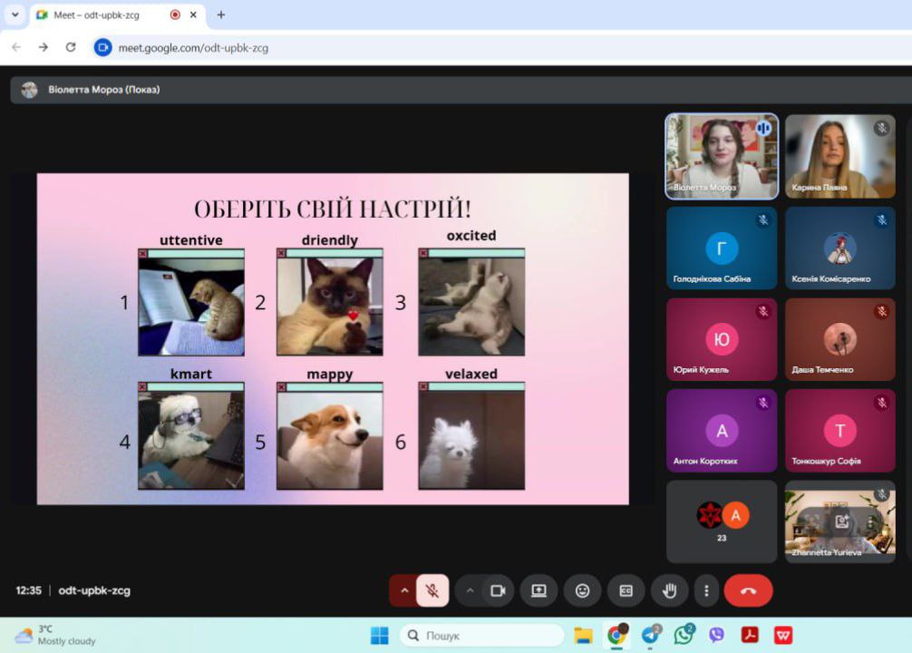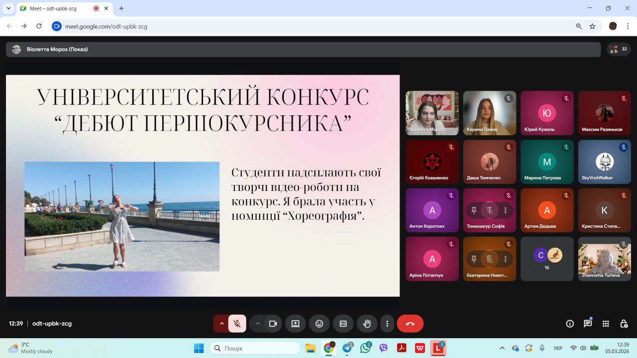 11 грудня 2025 року завідувач кафедри практики англійського усного і писемного мовлення, доц. О.В. Зосімова разом зі здобувачами вищої освіти факультету іноземної філології відвідали онлайн-церемонію нагородження лауреатів Всеукраїнського професійного творчого конкурсу відеоробіт англійською мовою “My University, My Story”!