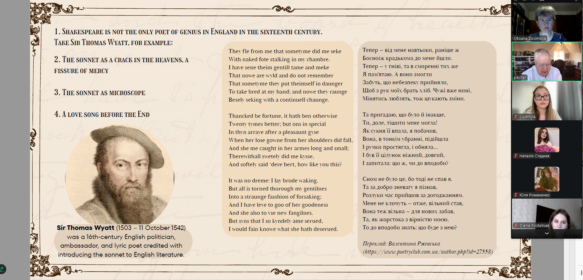 Під час заняття професор Пітчер ознайомив студентів з історією сонету як ліричного жанру та проаналізував із ними низку безсмертних сонетів В. Шекспіра. Дослідник запропонував нетривіальний погляд на природу цієї особливої поетичної форми, поява й розвиток якої в Європі збіглася з добою величних наукових відкриттів, концепцією «нового життя» (“La vita nuova”), переосмисленням ставлення до земних почуттів і прагнень людини. За словами професора Пітчера, сонет – це своєрідний мікроскоп, за допомогою якого поет відкриває читачеві свій внутрішній світ і людську природу загалом, це жанр, який у творчості В. Шекспіра має незмінно високу «емоційну температуру» й обов’язковий кульмінаційний момент (“switch or turn”), що передбачає певну зміну тональності.