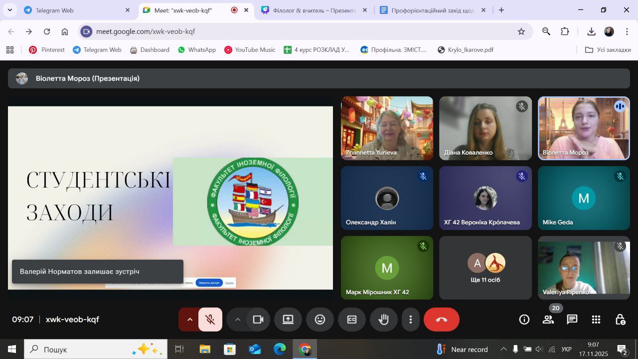 13 листопада 2024 р. викладач кафедри практики англійського усного і писемного мовлення Жаннетта Альбертівна Юр’єва разом зі студентами провела профорієнтаційний захід – онлайн-зустріч з учнями 11-х класів Комунального закладу «Харківський ліцей № 6 Харківської міської ради». Зустріч була присвячена темі «Важливість професії педагога в сучасному світі: виховання, знання та майбутнє суспільства». Була представлена профільна презентація з теми, обговорено позитивні аспекти навчання на факультеті іноземної філології. Також школярів зацікавив відеоролик про наш факультет.