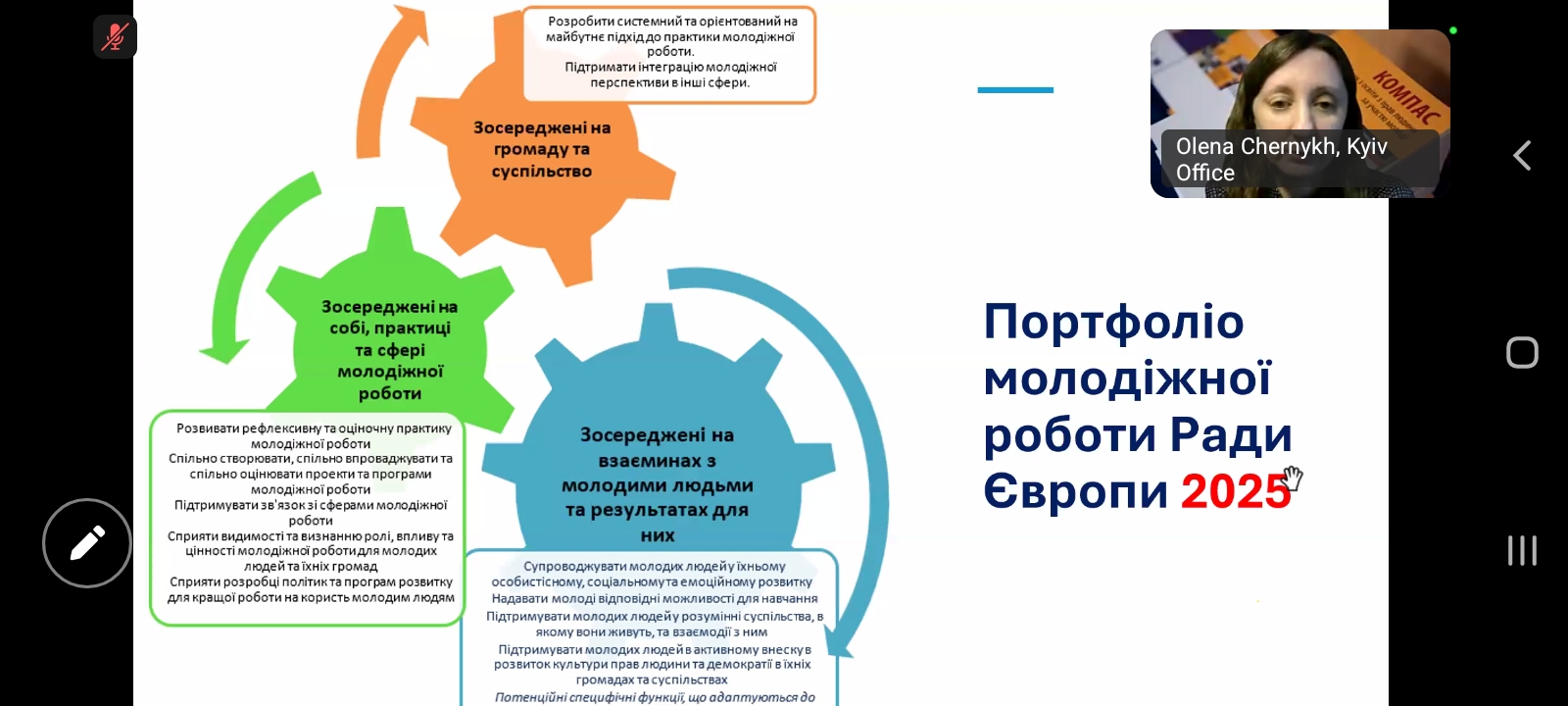 Спікерка виступу ‒ Олена Олександрівна Черних, кандидатка педагогічних наук, керівниця проєкту Ради Європи «Молодь за демократію в Україні: Фаза IV», Офіс Ради Європи в Україні ‒ розкрила інструменти розвитку громадянських компетентностей молоді, програми підтримки молоді, освітні ресурси Ради Європи, можливості участі в міжнародних освітніх ініціативах.