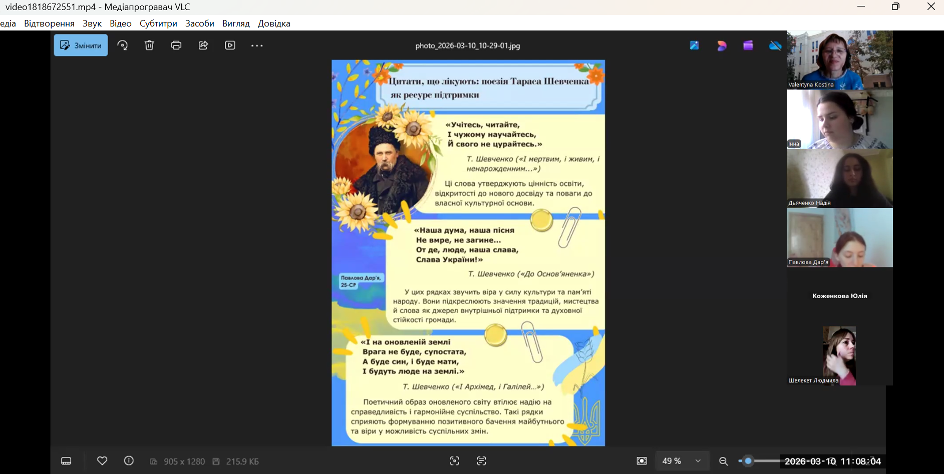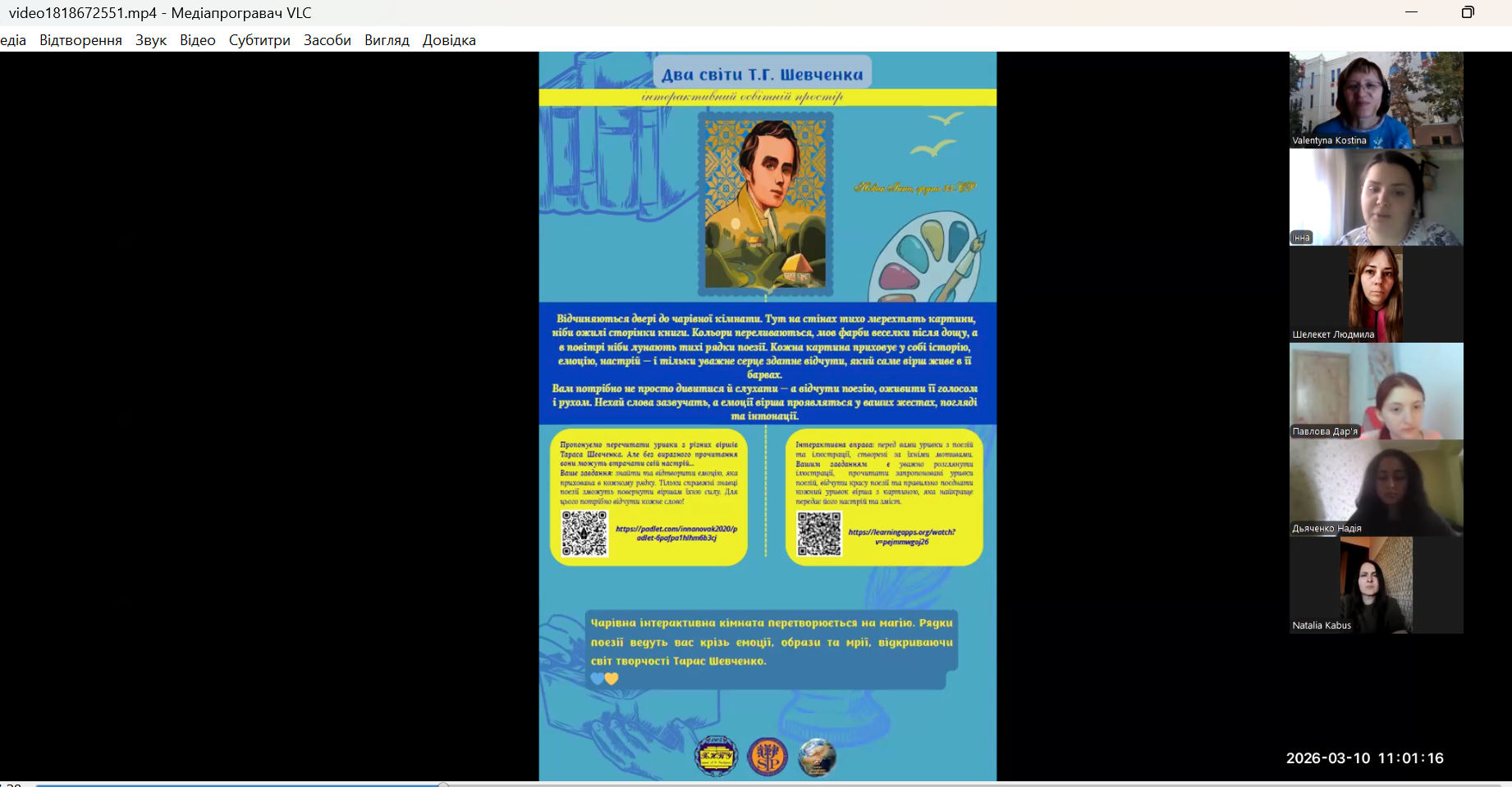 Метою зустрічі було ознайомлення з цікавими фактами біографії Тараса Григоровича та обговорення підготовлених здобувачами освіти виступів з доповідями за темою засідання: творче відео до поеми Т.Г. Шевченка «Катерина», що представила Рязанова Наталя, здобувачка вищої освіти групи 441; творчу розробку інтерактивної кімнати на тему: «Тарас Шевченко: поєднання поетичних рядків і кольорів» запропонувала голова СНТ ‒ Новак Інна, здобувачка вищої освіти групи 35-СР; постер на тему: «Цитати, що лікують: поезія Тараса Шевченка як ресурс підтримки» репрезентувала заступниця голови СНТ ‒ Павлова Дар’я, здобувачка вищої освіти групи 25-СР; інтерактивне Колесо Фортуни на тему: «Живе слово Кобзаря» представила Коженкова Юлія ‒ здобувачка вищої освіти групи 25-СР; буклет на тему: «Т.Г. Шевченко ‒ голос, що лунає крізь віки» було запропоновано Шелекет Людмилою, здобувачкою вищої освіти групи 15-СР.
