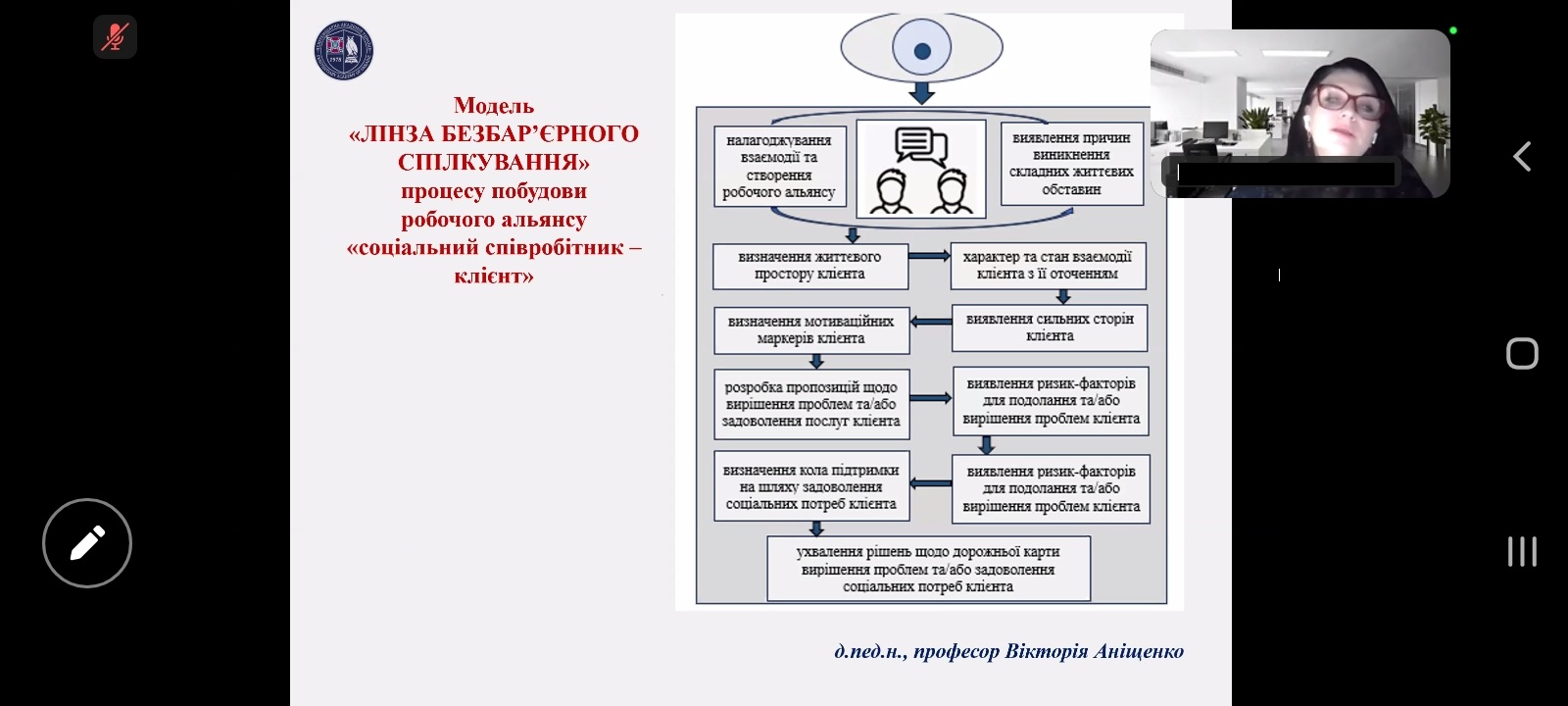 Спікерка виступу ‒ Аніщенко Вікторія Олександрівна, докторка педагогічних наук, професорка, професорка кафедри педагогіки та професійної етики Пенітенціарної академії України ‒ розкрила особливості створення безпечного й безбар’єрного простору у взаємодії соціального працівника та клієнта; визначила критерії оцінки ефективності співраці між соціальним працівником та клієнтом; акцентувала увагу на клієнто-центрованому підході, асертивних формах спілкування, емпатії. Наголосила, що постійне вдосконалення соціального працівника нерозривно пов’язано з розвитком комункативно-менеджерських навичок, як складової професійної комунікативно-менеджерської компетентності. Окрему увагу під час вебінару було приділено Калгарі-Кембриджській моделі взаємодії з клієнтом, де ключовими принципами виступають толерантність, емпатія, інклюзивність і безбар’єрність, етичність; пам’ятці «П’ять запитань для фахівців» щодо аналізу взаємодії з клієнтом. Спікерка поділилася розробленою моделлю «Лінза безбар’єрного спілкування» процесу побудови робочого альянсу «соціальний працівник ‒ клієнт».