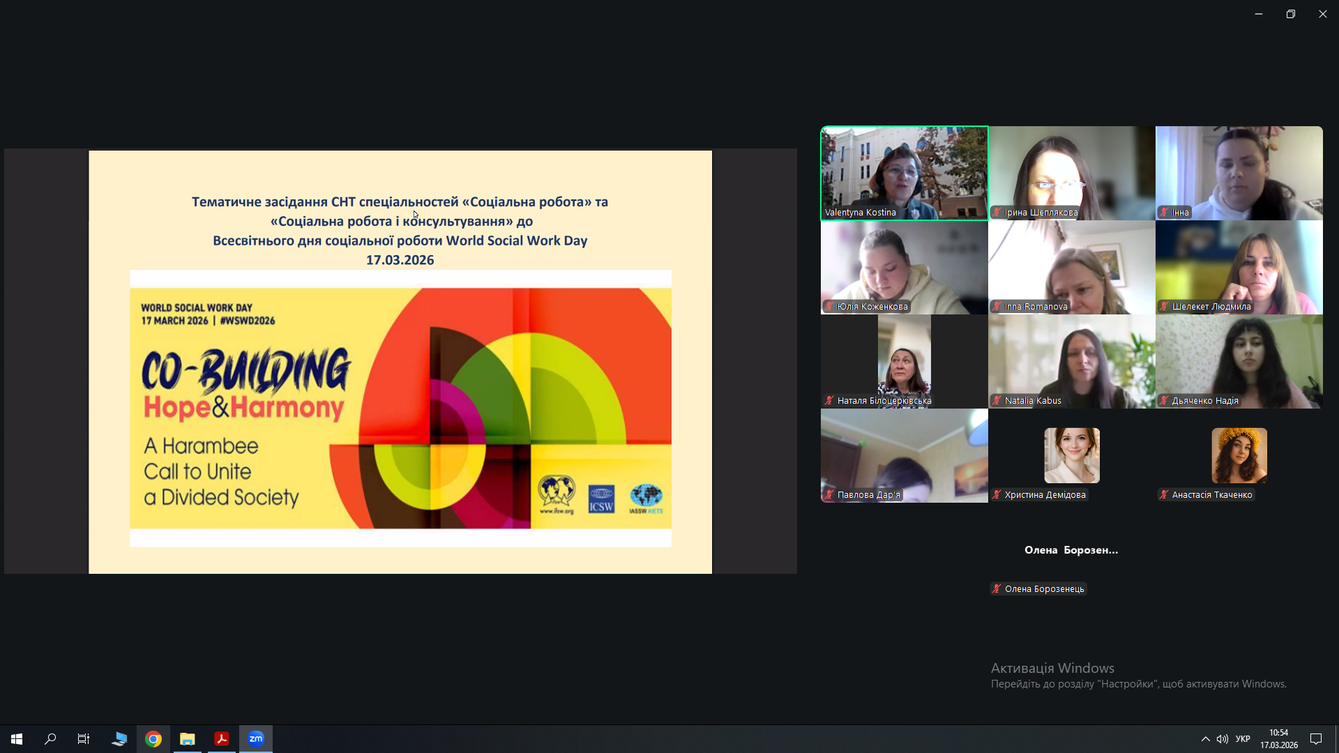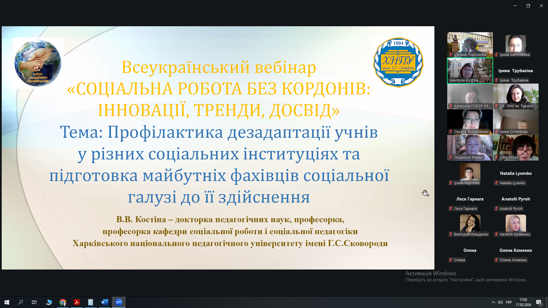 17.03.2026 р. науково-педагогічні працівники кафедри соціальної роботи і соціальної педагогіки й здобувачі спеціальностей І10 Соціальна робота та консультування й 231 Соціальна робота взяли участь у серії Всеукраїнських вебінарів «СОЦІАЛЬНА РОБОТА БЕЗ КОРДОНІВ: ІННОВАЦІЇ, ТРЕНДИ, ДОСВІД».