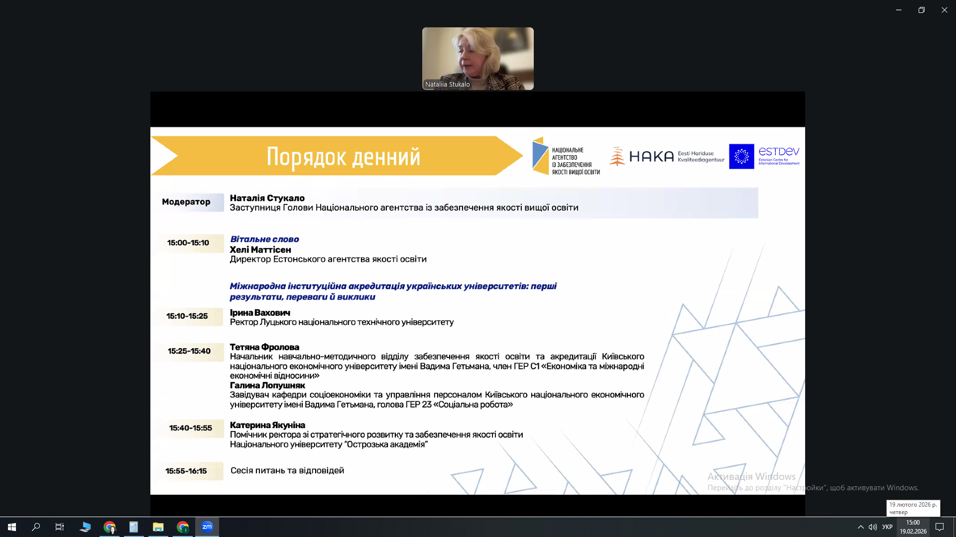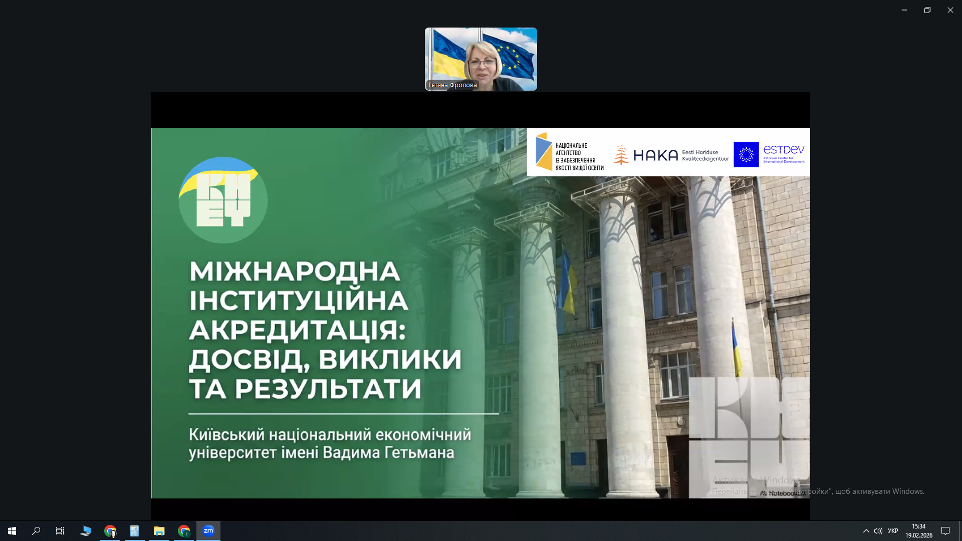 19.02.2026 р. науково-педагогічні працівники кафедри соціальної роботи і соціальної педагогіки долучилися до вебінару «Міжнародна інституційна акредитація українських університетів: перші результати, переваги й виклики». Захід відбувся в межах спільного проєкту Національного агентства із забезпечення якості вищої освіти та Естонського агентства якості освіти за підтримки ESTDEV.