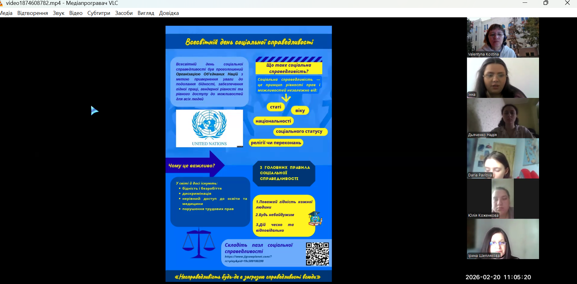- голова СНТ, здобувачка вищої освіти 35-СР групи ‒ Інна Новак з інформаційним постером та віртуальною пазл-активністю на тему: «Всесвітній день соціальної справедливості», що підкреслили значущість дотримання принципів соціальної справедливості й необхідності кожного докладати власних зусиль;
