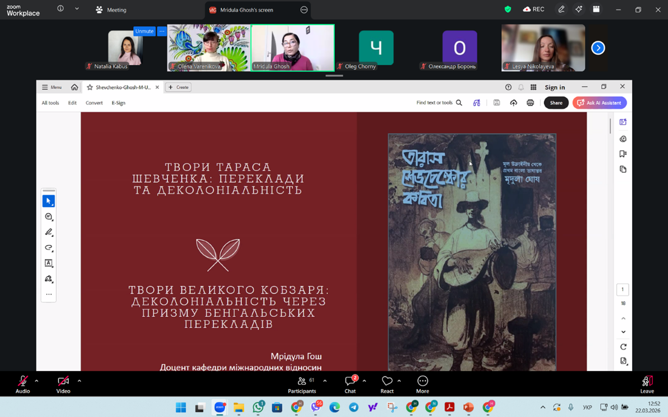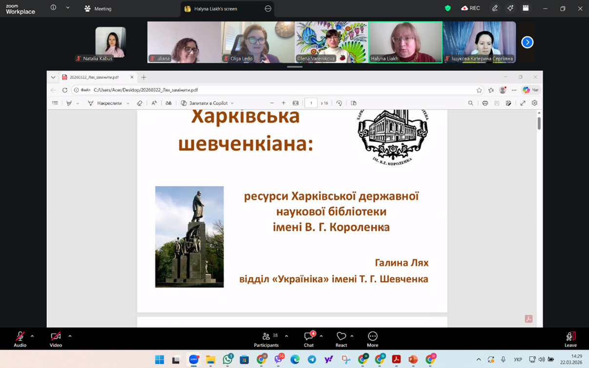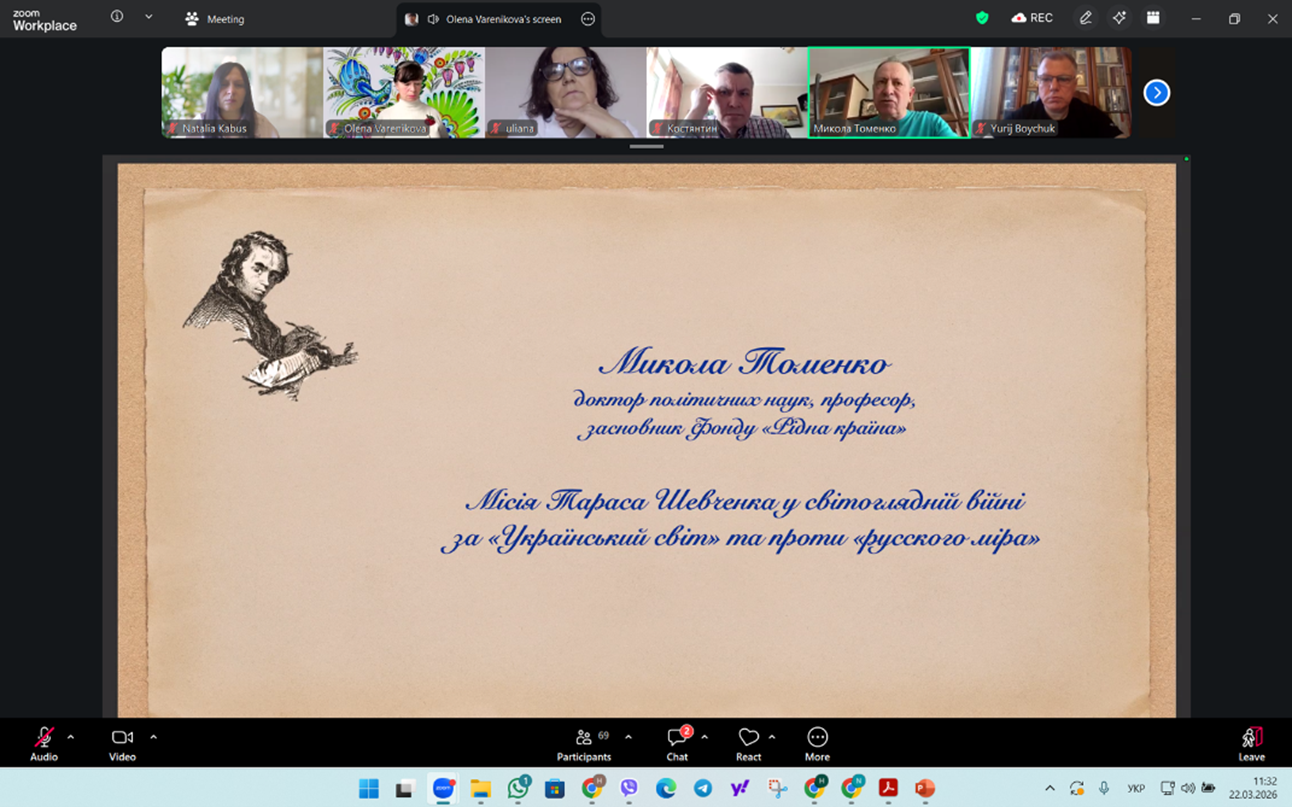 22.03.2026 викладачі кафедри соціальної роботи і соціальної педагогіки і здобувачі спеціальностей 231 «Соціальна робота» та І10 «Соціальна робота та консультування» взяли участь у ІІ Міжнародному круглому столі «Мій і наш Шевченко», присвяченому 212-річниці від дня народження Тараса Шевченка, організованому Харківським національним педагогічним університетом імені Г.С.Сковороди спільно з Харківським національним університетом радіоелектроніки, Світовою Федерацією Українських Жіночих Організацій, Асоціацією «Українки Швейцарії», Українською школою в Женеві.