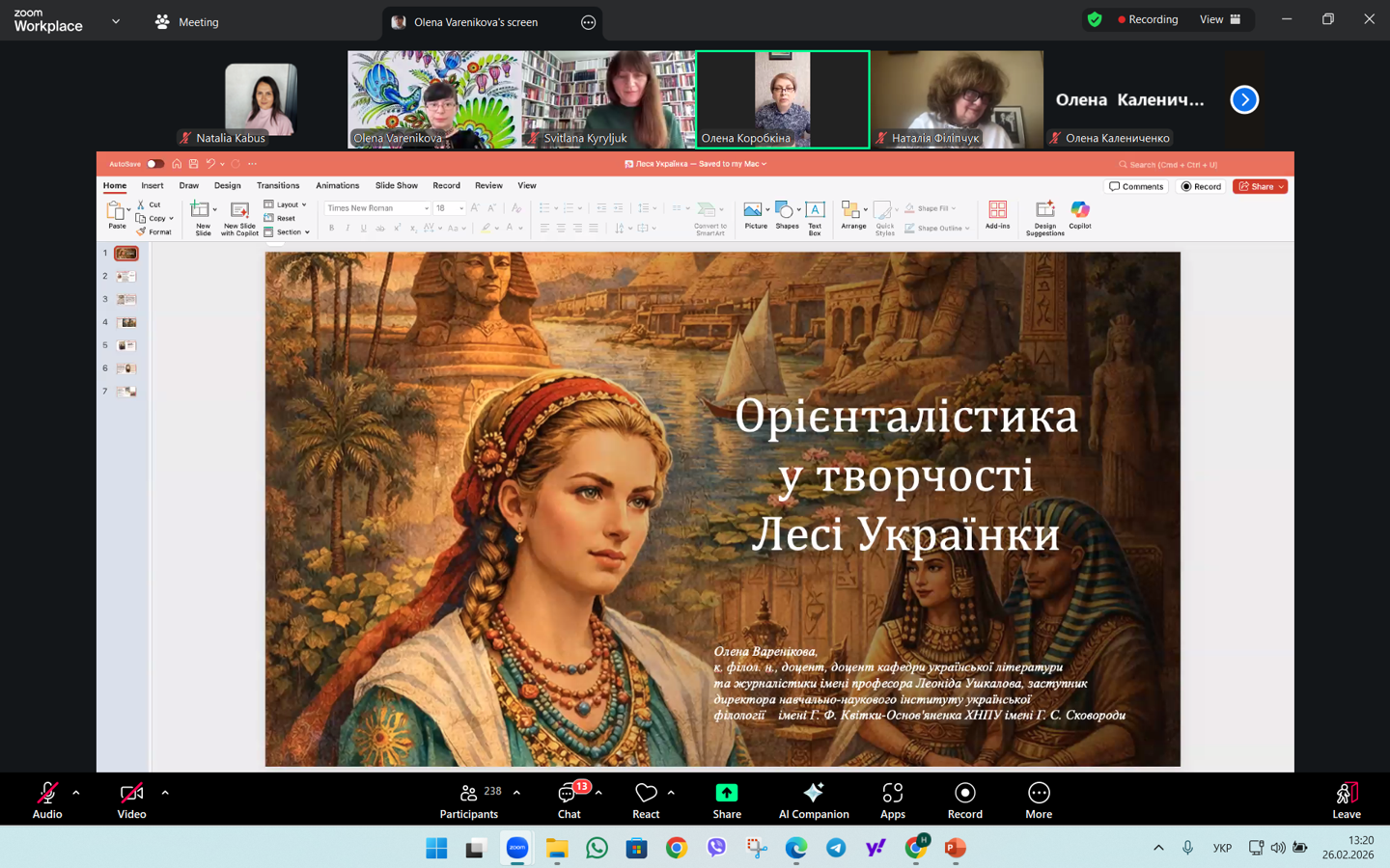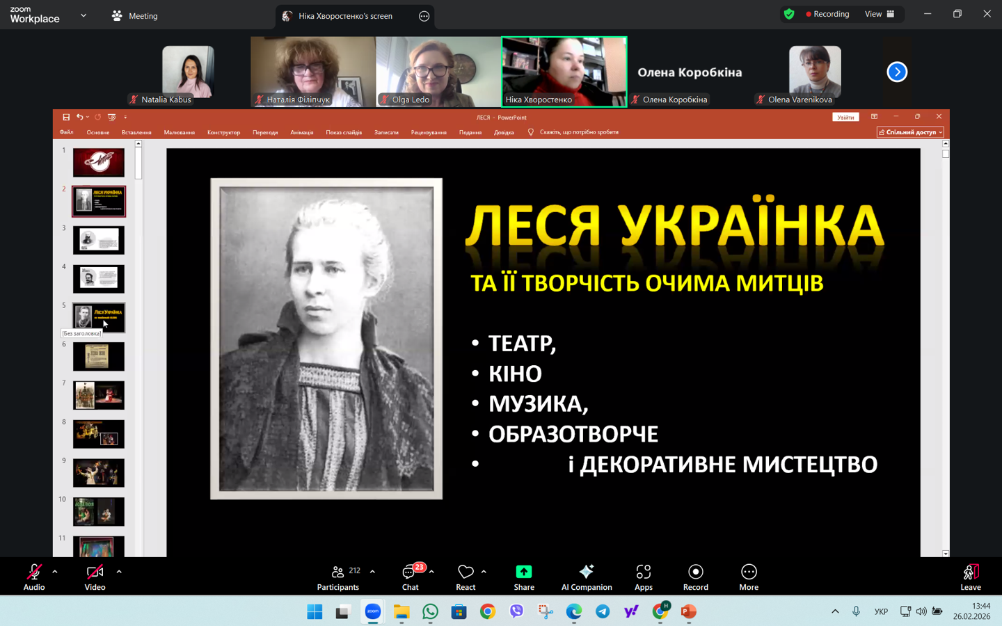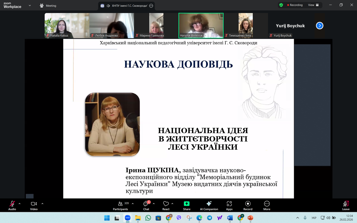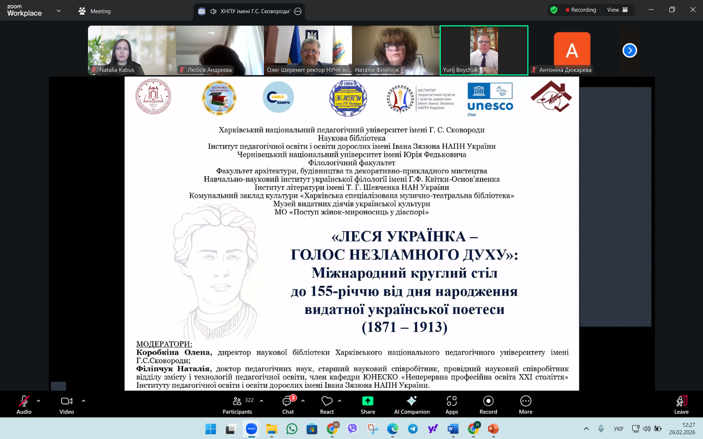 26.02.2026 р. науково-педагогічні працівники кафедри соціальної роботи і соціальної педагогіки й здобувачі спеціальностей І10 Соціальна робота та консультування й 231 Соціальна робота взяли участь у Міжнародному круглому столі «Леся Українка ‒ голос незламного духу» до 155-річчя від дня народження поетеси.