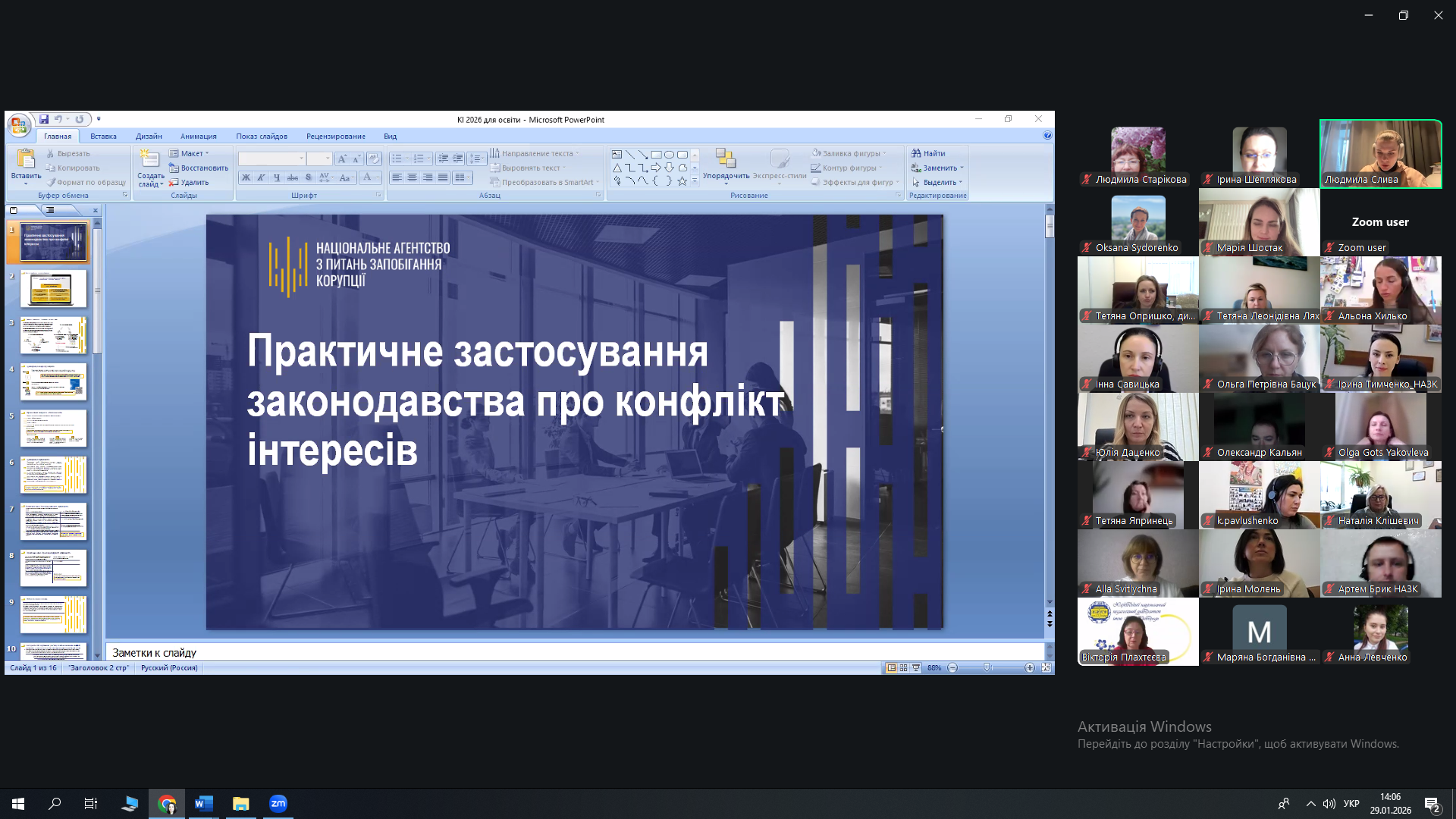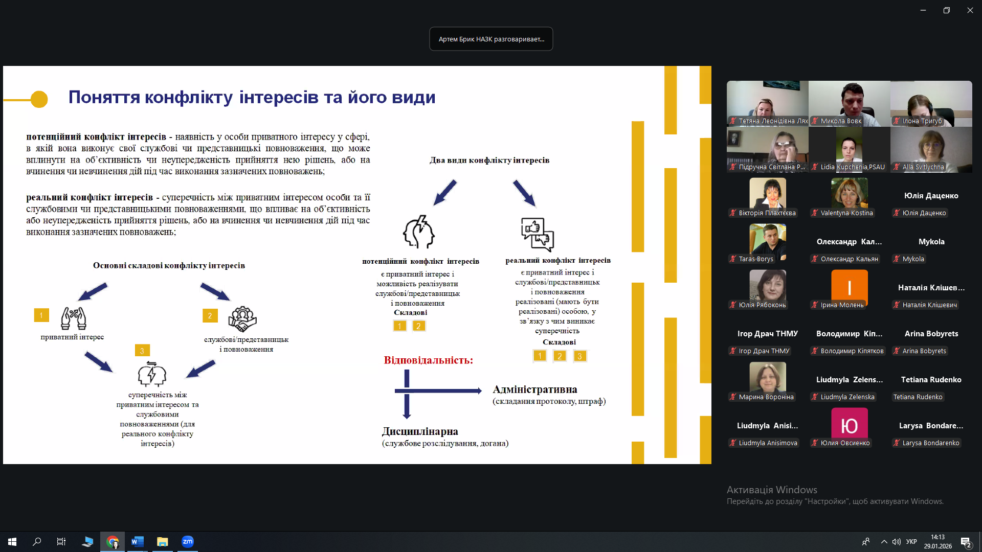 29.01.2026 р. науково-педагогічні працівники кафедри соціальної роботи і соціальної педагогіки й здобувачі спеціальності І10 Соціальна робота та консультування і 231 Соціальна робота взяли участь в онлайн-зустрічі «Практичне застосування законодавства про конфлікт інтересів». Захід було організовано Національним агентством із запобігання корупції для співробітників, науково-педагогічних працівників та здобувачів пілотних закладів вищої освіти – учасників проєкту «Прозорі університети».