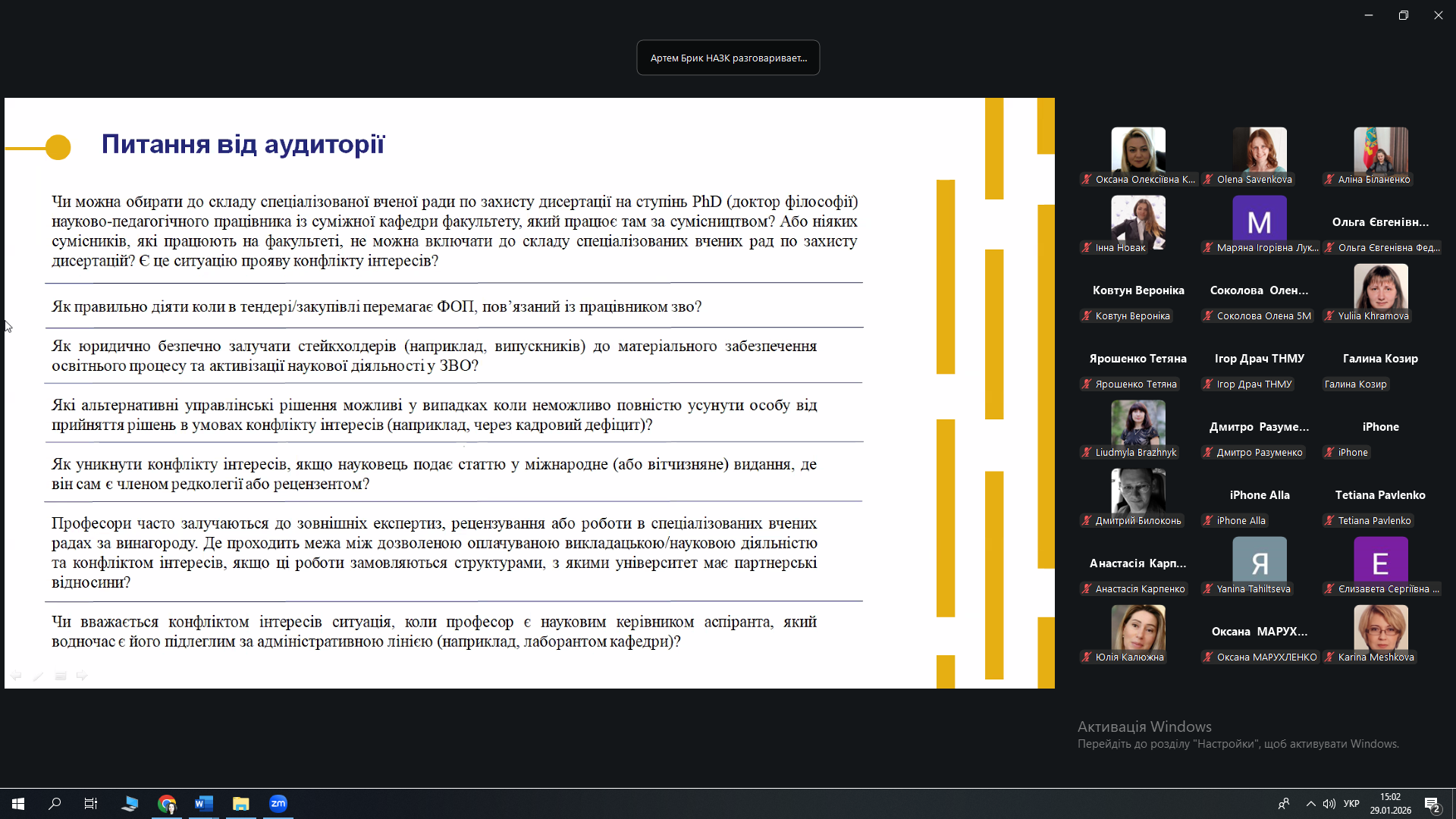 Учасники заходу отримали практичні роз’яснення щодо типових ситуацій конфлікту інтересів у ЗВО, поширених ризиків і помилок, а також мали можливість поставити запитання експерту. Щиро дякуємо спікеру, Артему Брику – за можливість долучитися до обговорення актуального питання забезпечення доброчесності та прозорості діяльності університету.
