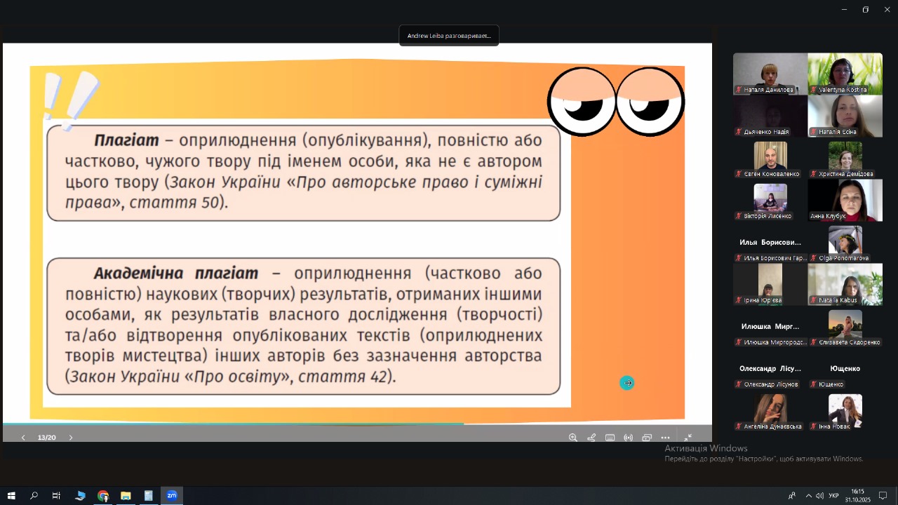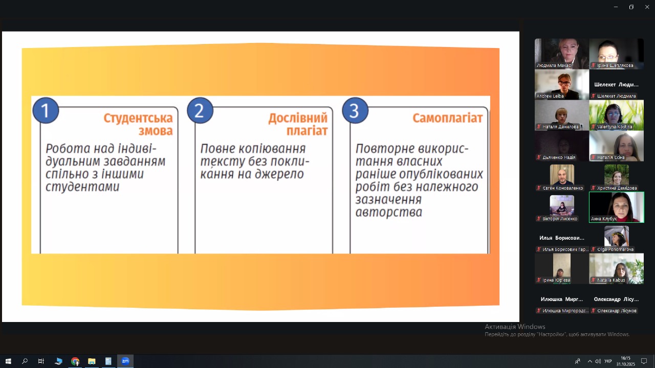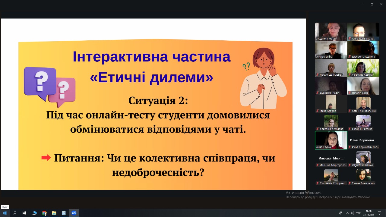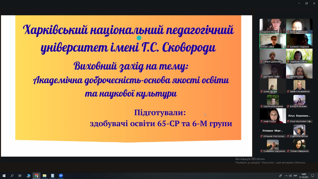 31 жовтня 2025 року з метою формування у здобувачів вищої освіти високої культури навчальної та наукової діяльності, розвитку відповідального ставлення до процесу здобуття знань і підвищення рівня обізнаності щодо етичних стандартів у науковій сфері, у межах проходження науково-педагогічної практики здобувачами другого (магістерського) рівня вищої освіти другого року навчання було проведено виховний захід на тему: «Академічна доброчесність – основа якості освіти та наукової культури», в якому взяли участь здобувачі першого і другого рівнів вищої освіти спеціальностей 231 Соціальна робота і І10 Соціальна робота і консультування й науково-педагогічні працівники кафедри соціальної роботи і соціальної педагогіки.