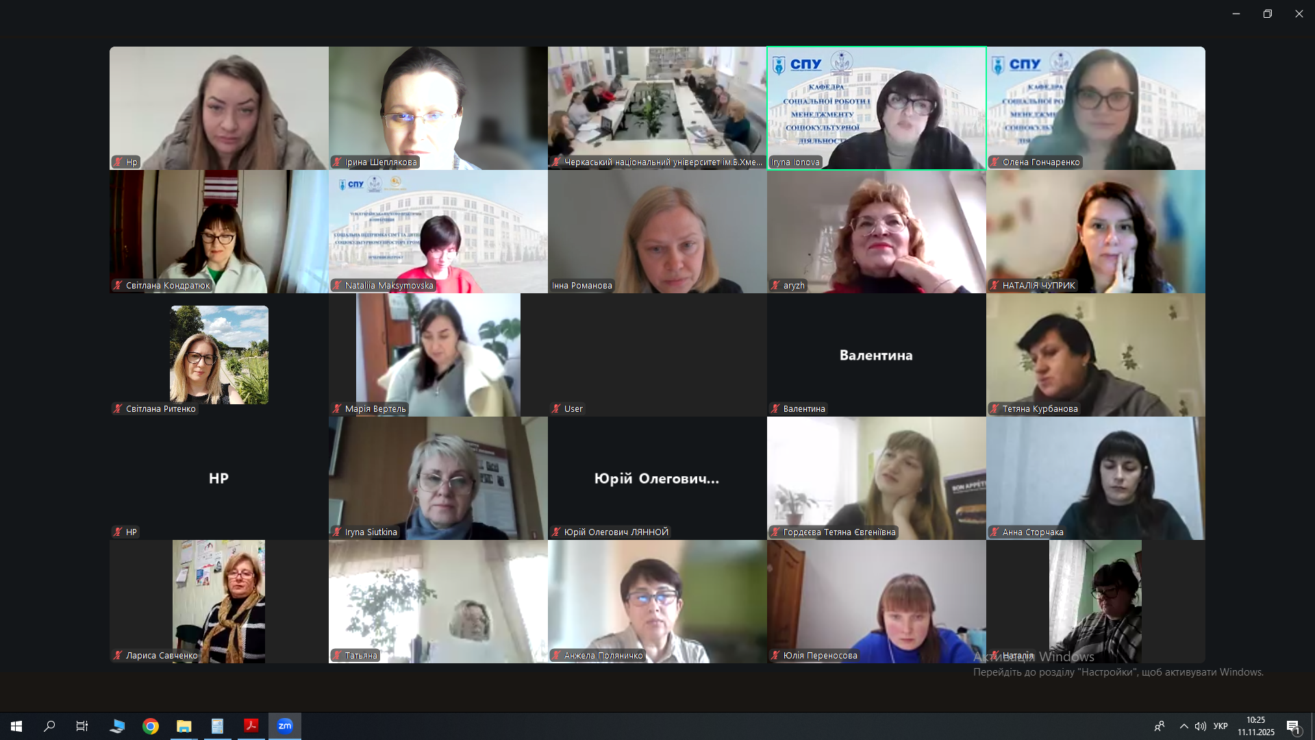12 квітня 2025 року в межах навчальної дисципліни «Опіка та піклування з практикумом» д.п.н., професоркою кафедри соціальної роботи і соціальної педагогіки Костіною Валентиною Вікторівною спільно із гостьовою спікеркою, к.п.н., доценткою кафедри соціальної педагогіки та корекційної освіти Дрогобицького державного педагогічного університету імені Івана Франка ‑ Смеречак Лесею Іванівною, проведено відкриту зустріч з практико-зорієнтованою взаємодією для здобувачів першого (бакалаврського) рівня вищої освіти спеціальності 231 Соціальна робота груп 25-СР і 241 ХНПУ імені Г.С. Сковороди та групи СР 2025 Б ДДПУ імені Івана Франка у форматі Zoom конференції на тему: «Практичні аспекти здійснення соціальної роботи з дітьми та молоддю з інвалідністю, що потребують опіки та піклування (у взаємодії з ІРЦ, відкрита зустріч)».