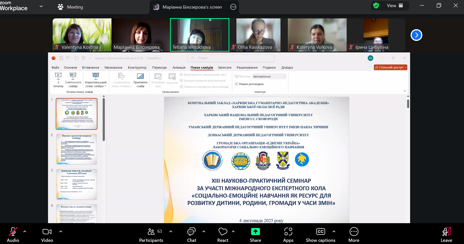 4.11.2025 р. кафедра соціальної роботи і соціальної педагогіки Харківського національного педагогічного університету імені Г.С.Сковороди була співорганізатором ХІІІ Науково-практичного семінару «Соціально-емоційне навчання як ресурс для розвитку дитини, родини, громади у часи змін», що проходив на базі Комунального закладу «Харківська гуманітарно-педагогічна академія».