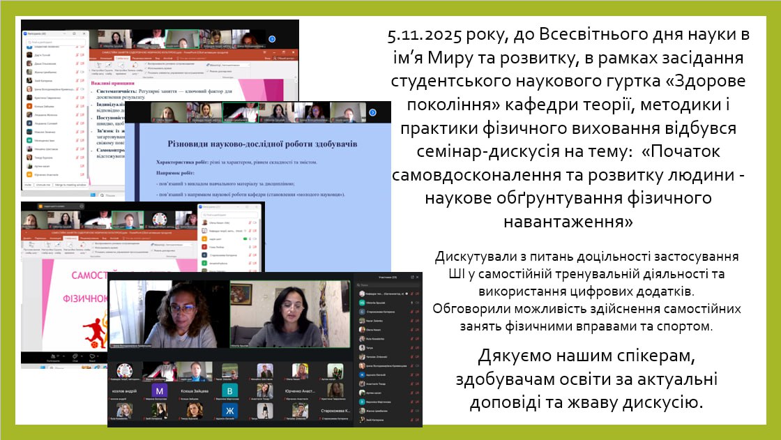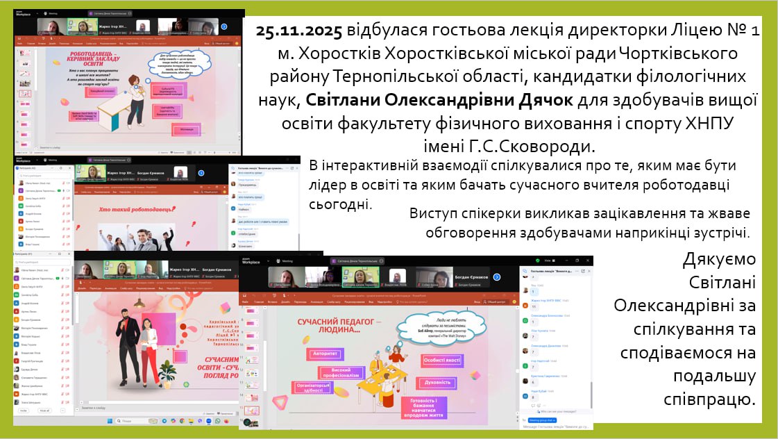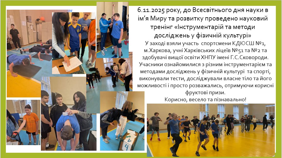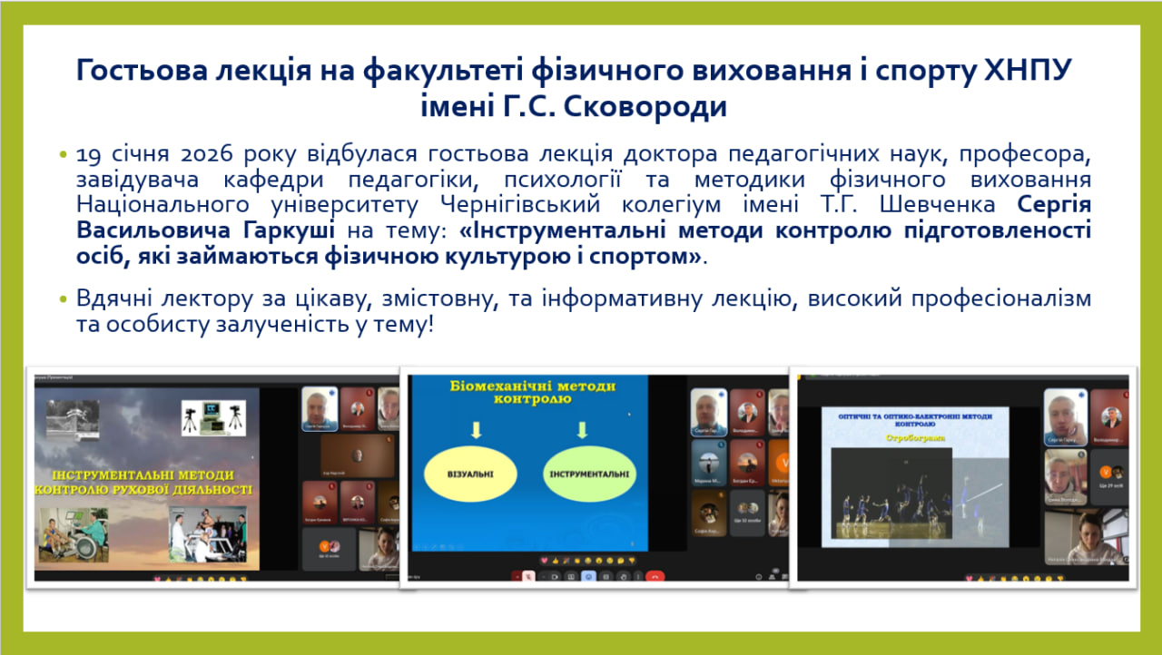 20 квітня 2023 року в межах Методичного тижня, який проводиться на базі ХНПУ імені Г.С. Сковороди відбувся семінар за темою «Уроки фізичної культури в закладах середньої освіти під час дистанційної форми організації навчання» за участю науково-педагогічних працівників та деканату факультету фізичного виховання і спорту, вчителів фізичної культури, методистів, здобувачів освіти.
