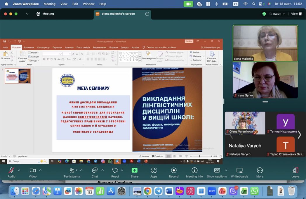 18 листопада 2025 року відбувся науково-практичний семінар з питань викладання лінгвістичних дисциплін різної спрямованості у вищій школі. Мета семінару — обмін методичним досвідом, власними напрацюваннями провідних мовознавців, викладачів-словесників з усієї України (близько 60 учасників з 12 освітніх та наукових установ). Ініціатором семінару стала кафедра українознавства і лінгводидактики імені професора О.Г. Муромцевої (навчально-науковий інститут української філології імені Г.Ф. Квітки-Основ’яненка), де цього року була створена науково-практична лабораторія з методики викладання філологічних дисциплін у закладах освіти (керівник проф. Олена Маленко). Семінар працював у п’яти тематичних кейсах відповідно до спрямувань дисциплін: власне лінгвістичний компонент, блок редакторсько-журналістських дисциплін, лінгводидактика, соціокультурний складник змісту мовних дисциплін, полоністика. Це забезпечило конкретне обговорення актуальних питань щодо сприятливого освітнього середовища в ЗВО. Були цікаві теми, жваві дискусії, живі емоції. Це означає, що такі зустрічі фахівців важливі й потрібні.
