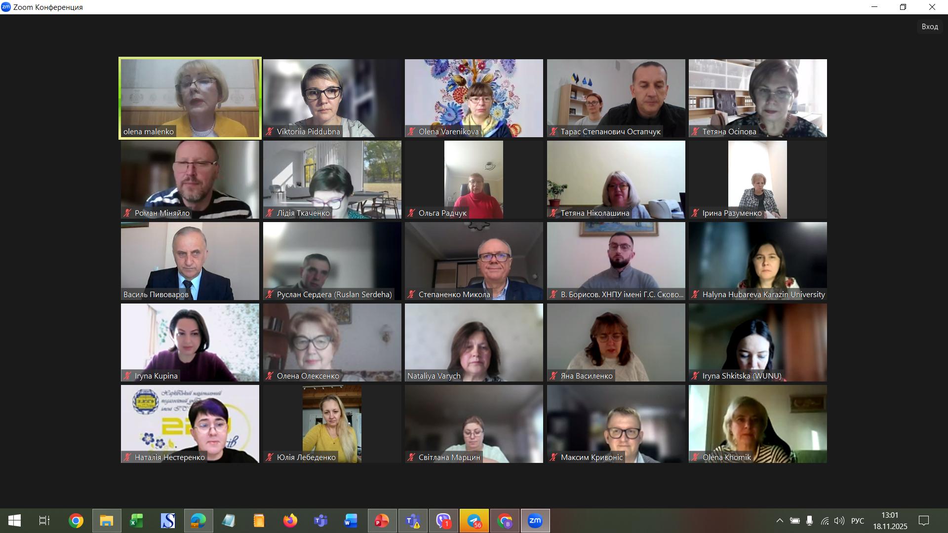 11 лютого 2025 на базі Закарпатського обласного інституту післядипломної педагогічної освіти відбулася дистанційна Всеукраїнська нарада «Актуальні проблеми викладання навчальних дисциплін в умовах викликів сьогодення», яка була ініційована МОН України, Інститутом модернізації змісту освіти, Науково-методичним центром вищої та фахової передвищої освіти. ХНПУ імені Г. С. Сковороди став партнером цього заходу й був представлений участю проф. Олени Маленко в роботі практичного семінару «Новітні підходи та націєцентричний зміст в освітньому процесі задля мотивації здобувачів освіти» з темою «Діамонологічна компетентність у невизначених умовах сучасного світу».