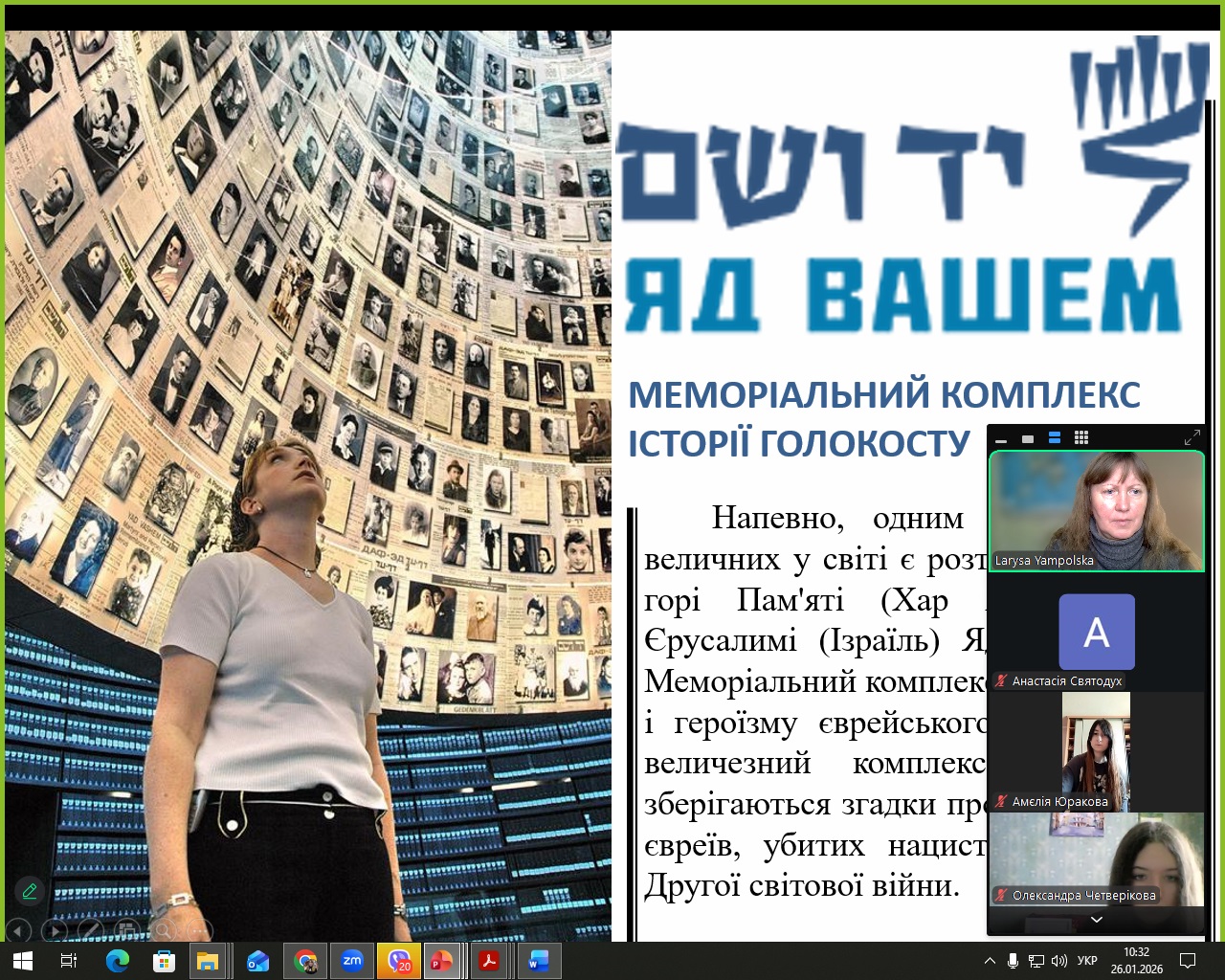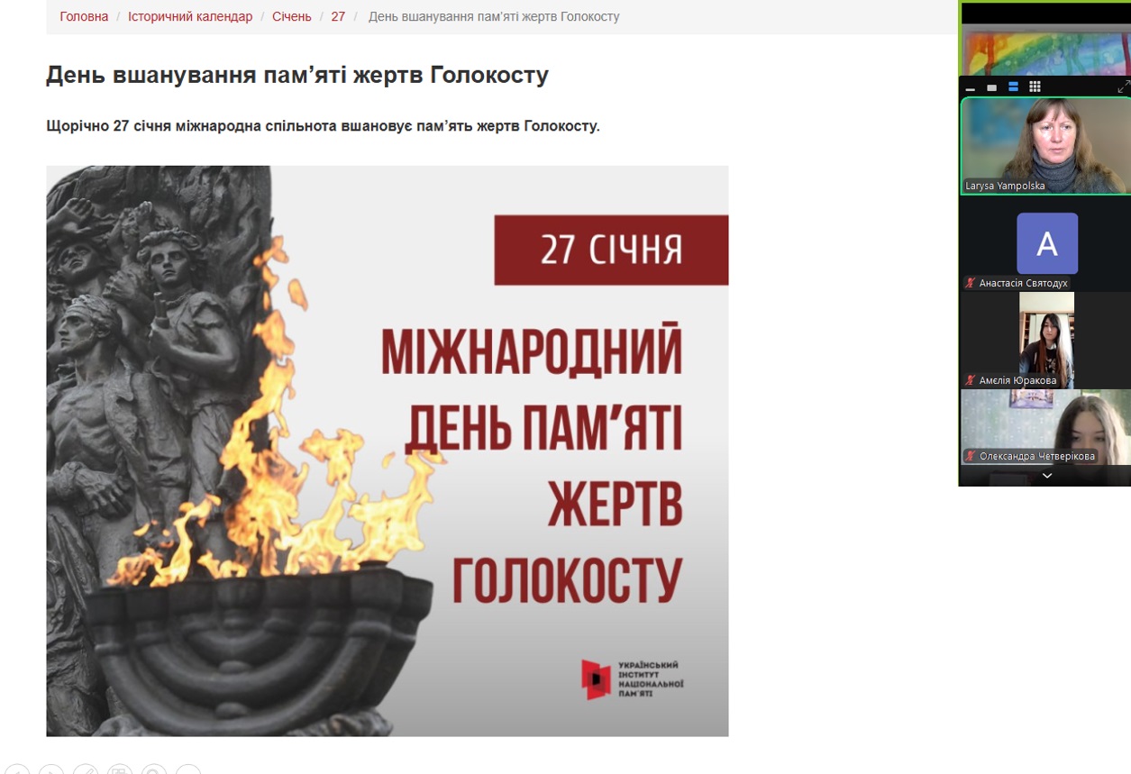 27 січня, до Міжнародного дня пам’яті жертв Голокосту, кандидат історичних наук, доцент, завідувач кафедри всесвітньої історії Ямпольська Лариса Миколаївна провела з учнями 10-Б класу КЗ «Харківський ліцей № 90 Харківської міської ради» меморіальний захід «Пам’ять, що гартує стійкість».