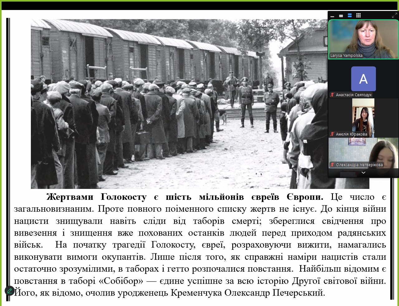 Аналіз передумов і наслідків Шоа у поєднанні з акцентом на цінності людського життя допоміг молоді краще зрозуміти масштаб катастрофи та важливість збереження історичної правди. Під час заходу десятикласники мали змогу не лише почути факти про геноцид, а й долучитися до дискусії про толерантність, моральний вибір і недопущення подібних злочинів у майбутньому. Особливу увагу було приділено трагедії Бабиного Яру в Україні, де у 1941-1943 рр. загинуло понад 100 тис. людей, та повстанню у таборі смерті «Собібор» у жовтні 1943 р. Учні ознайомилися з історією меморіальних комплексів у Берліні, Будапешті, Єрусалимі, що дозволило усвідомити масштаб катастрофи, яка забрала життя 6 млн євреїв Європи. Використання візуальних джерел допомогло старшокласникам осягнути важливість захисту людської гідності та протидії будь-яким проявам ненависті в сучасному світі.