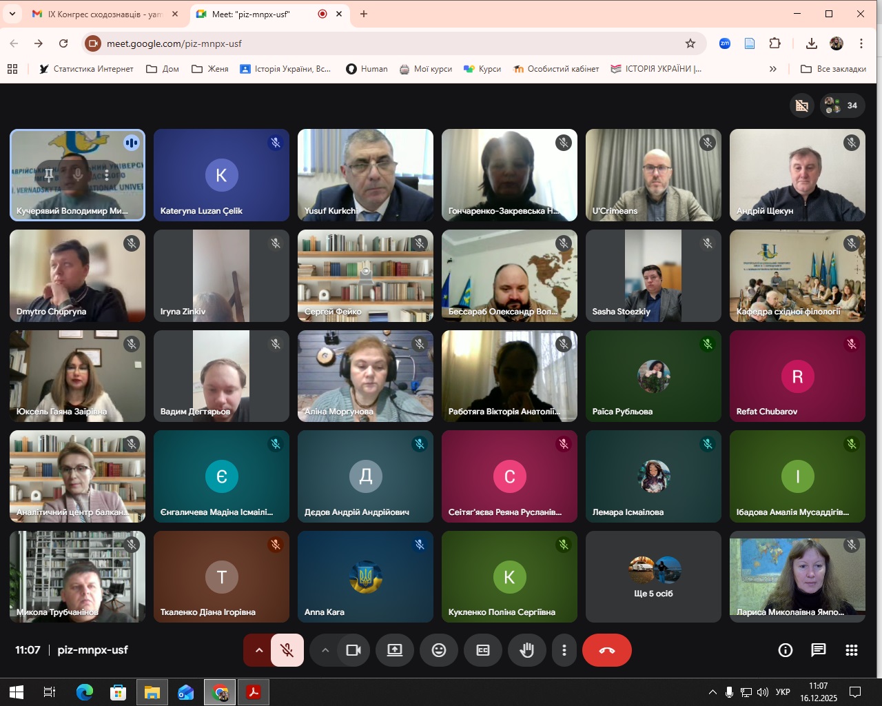 16 грудня 2025 р. у Навчально-науковому інституті філології та журналістики Таврійського національного університету імені В.І. Вернадського відбувся IX Конгрес сходознавців – знакова науково-громадська подія, присвячена актуальним гуманітарним викликам, збереженню національної ідентичності, розвитку мовної та культурної політики, а також питанням гуманітарної безпеки Сходу та Криму. Захід об’єднав науковців, дослідників, аспірантів і студентів з різних регіонів України та пройшов у дистанційному форматі, що дозволило забезпечити широкий науковий діалог і міжрегіональну експертну взаємодію.
